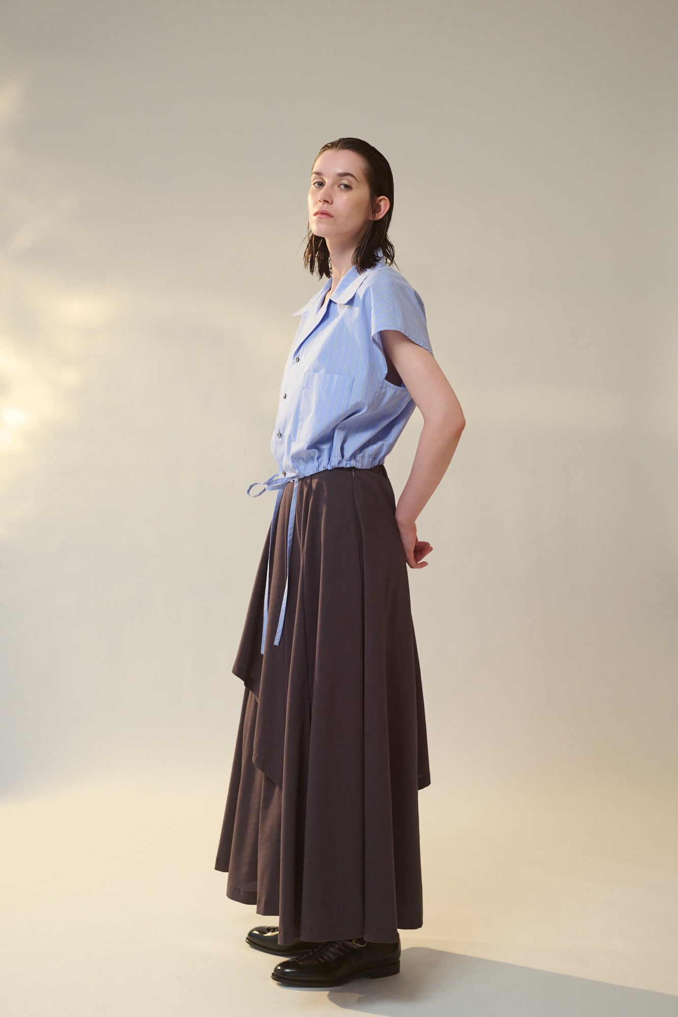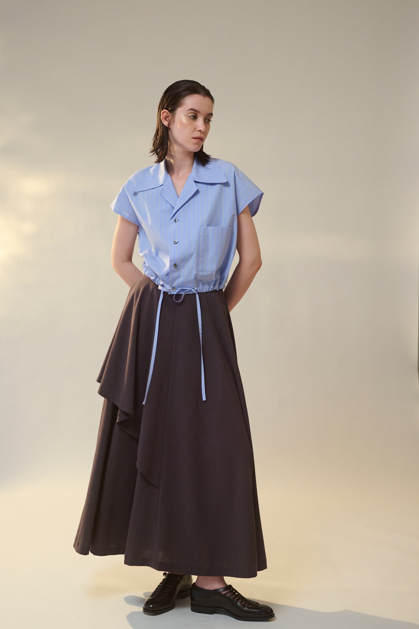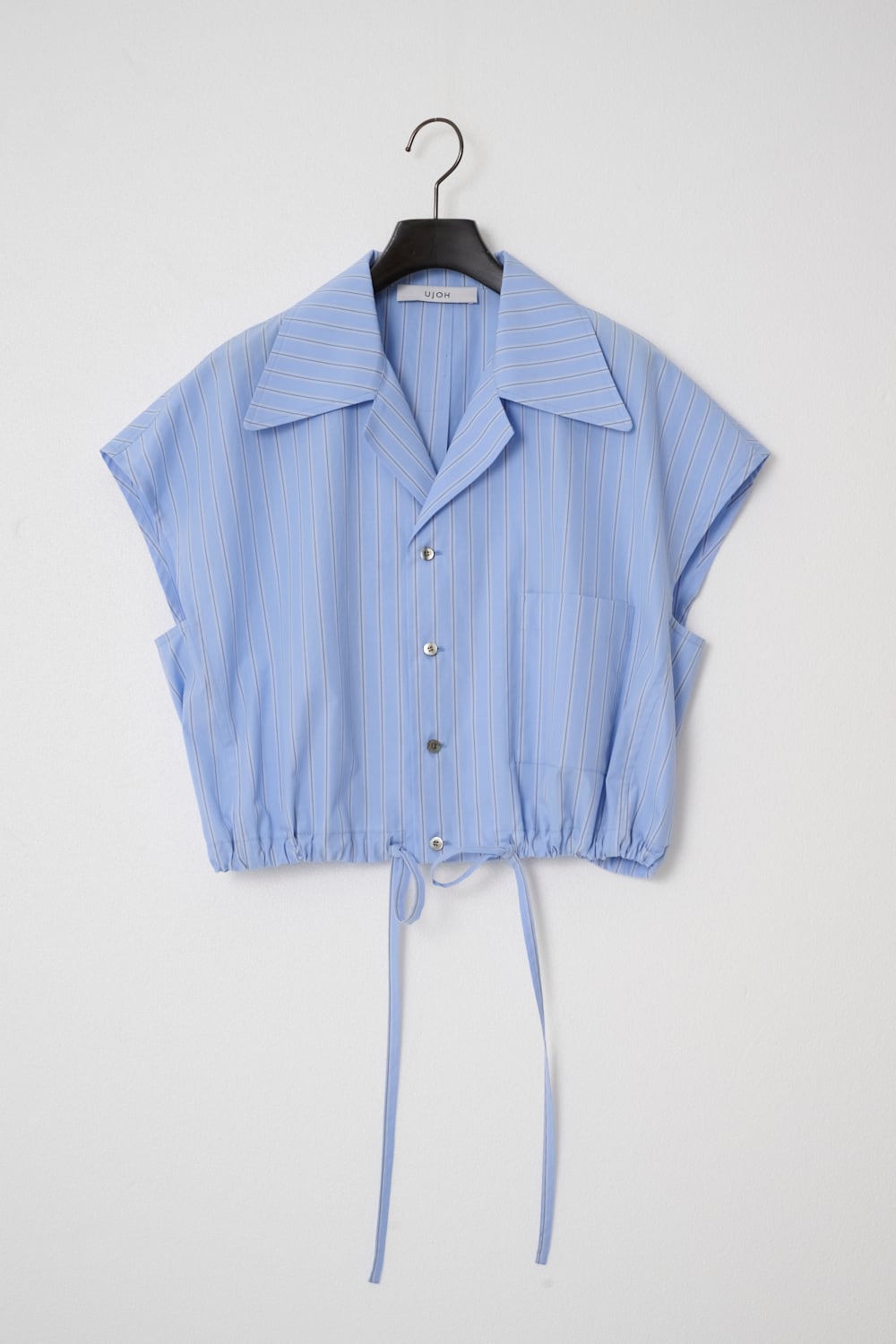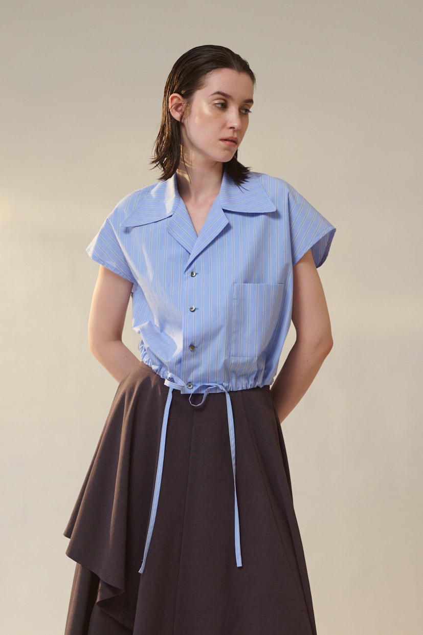 コンパクトなシルエットに大きい衿が特徴のオープンカラーシャツです。ギャザーを寄せたウエストから垂れるドローコードがアクセントになっています。
