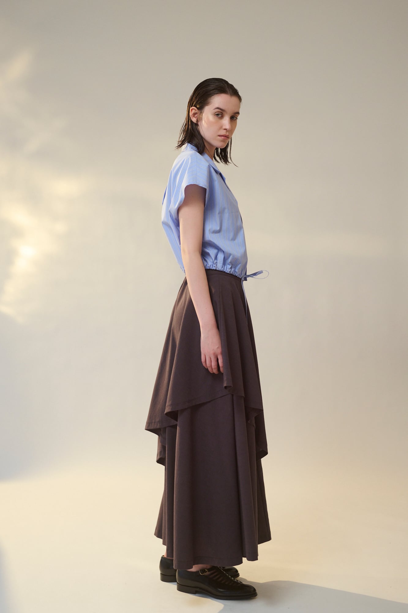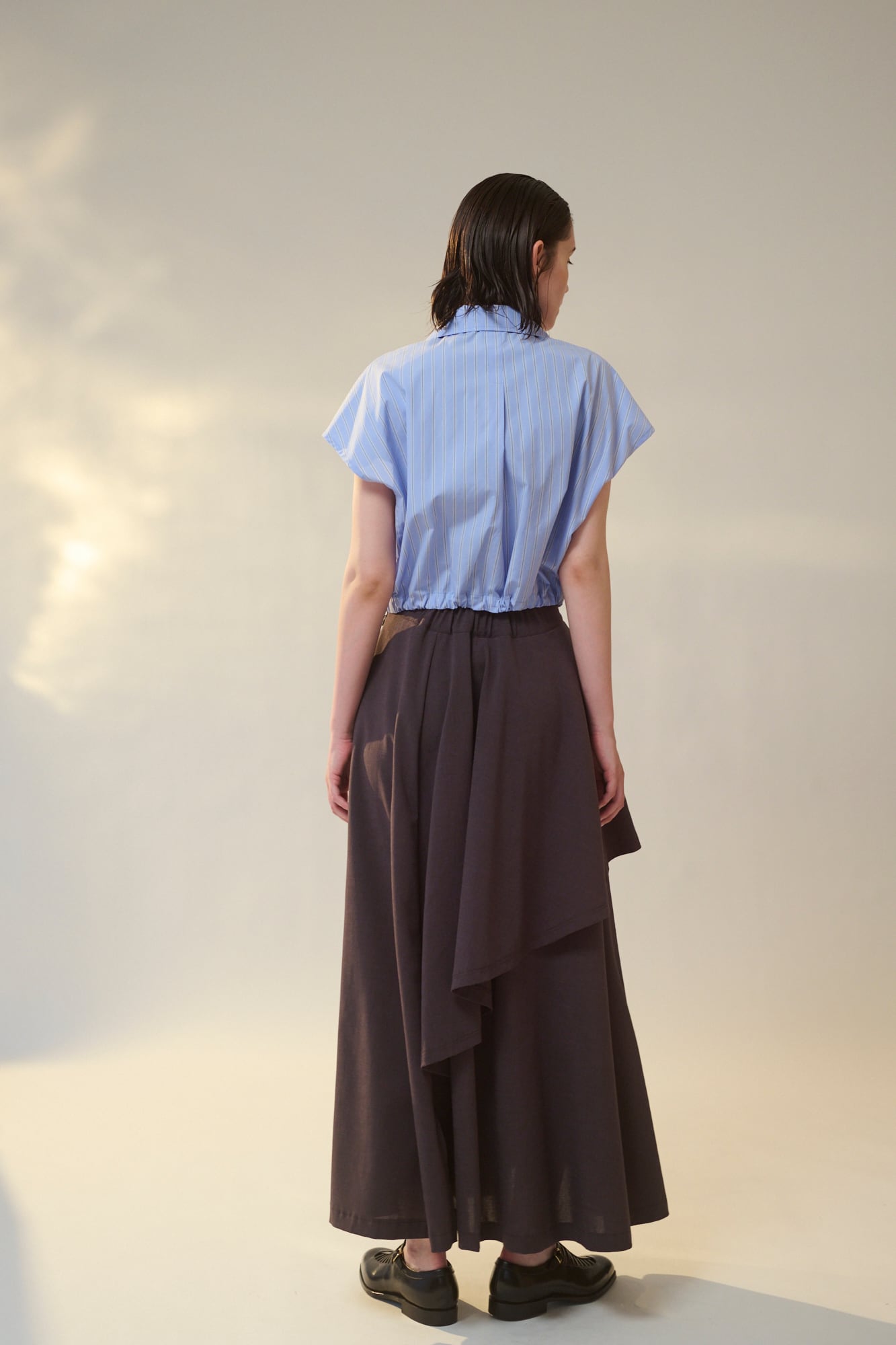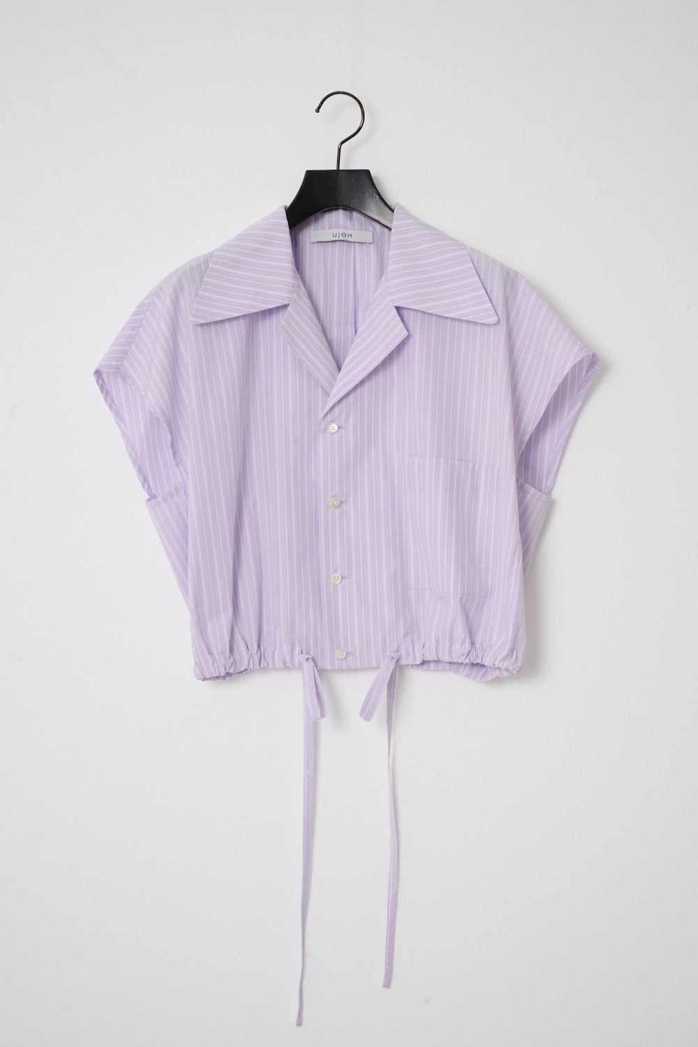 コンパクトなシルエットに大きい衿が特徴のオープンカラーシャツです。ギャザーを寄せたウエストから垂れるドローコードがアクセントになっています。