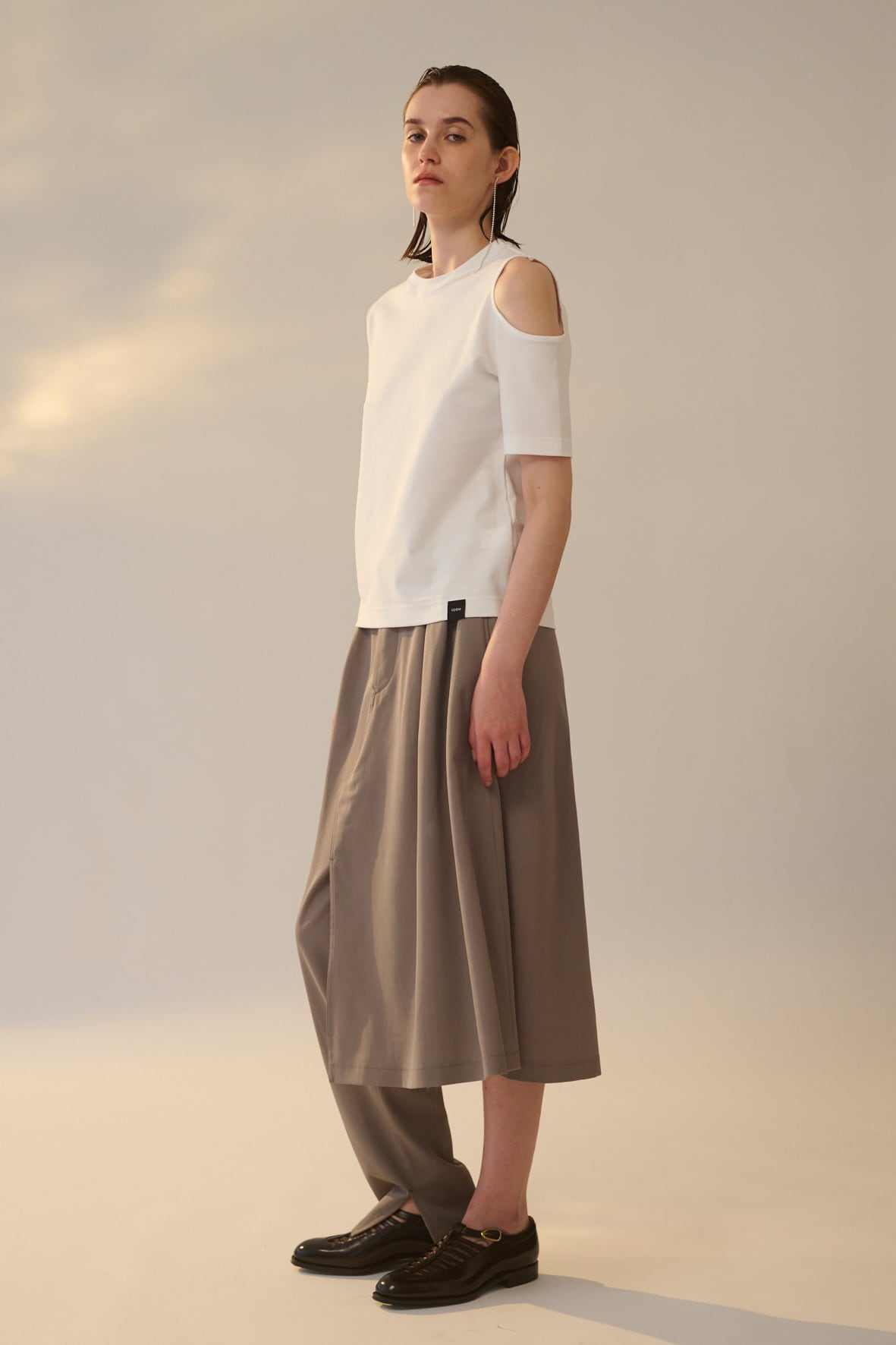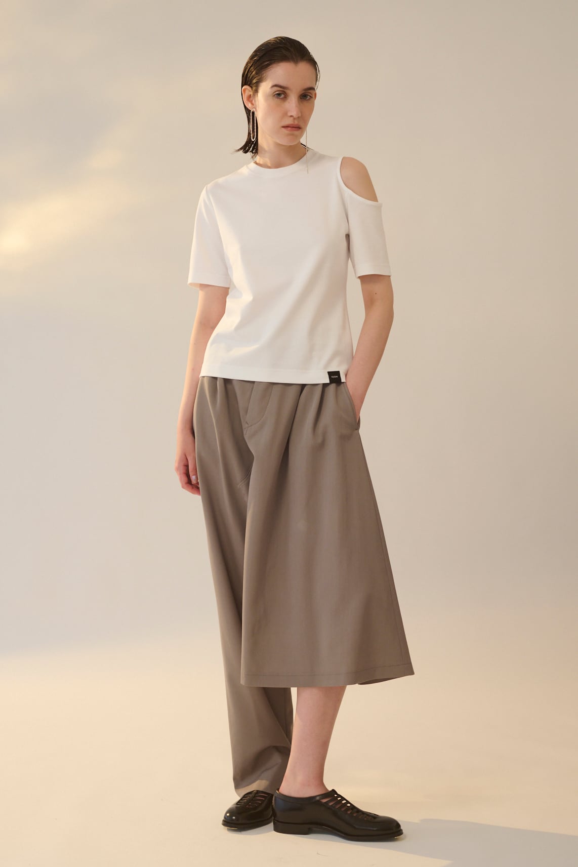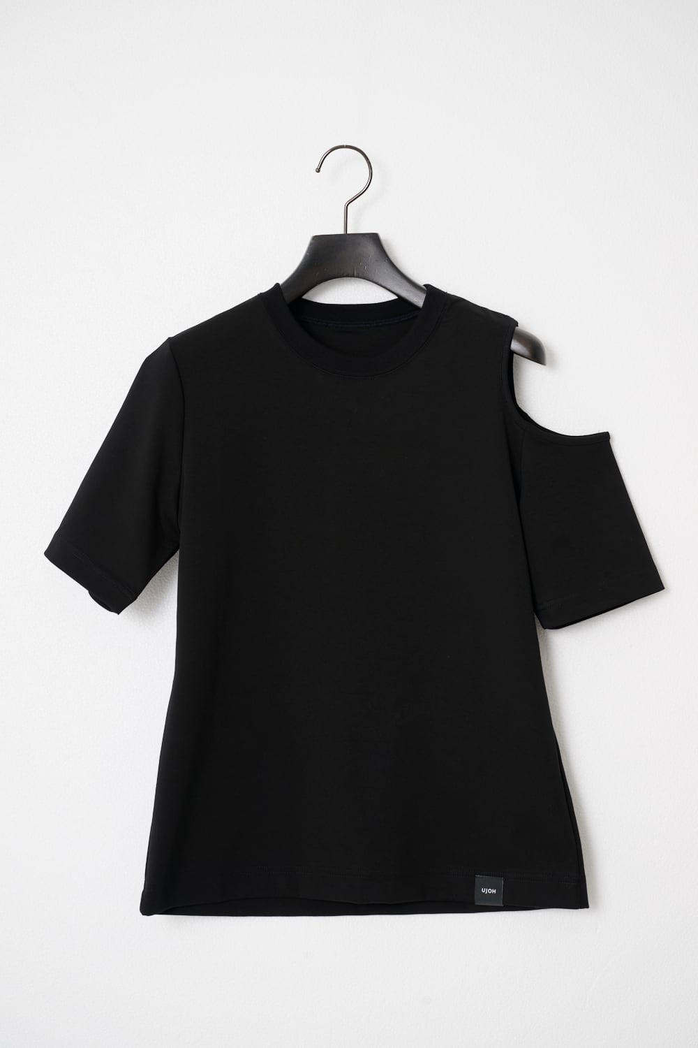 左肩をカーブにカットしたデザインがポイントのカットソーです。カッティングが際立つミニマルなデザインで日常に取り入れやすいバランスに仕上げました。