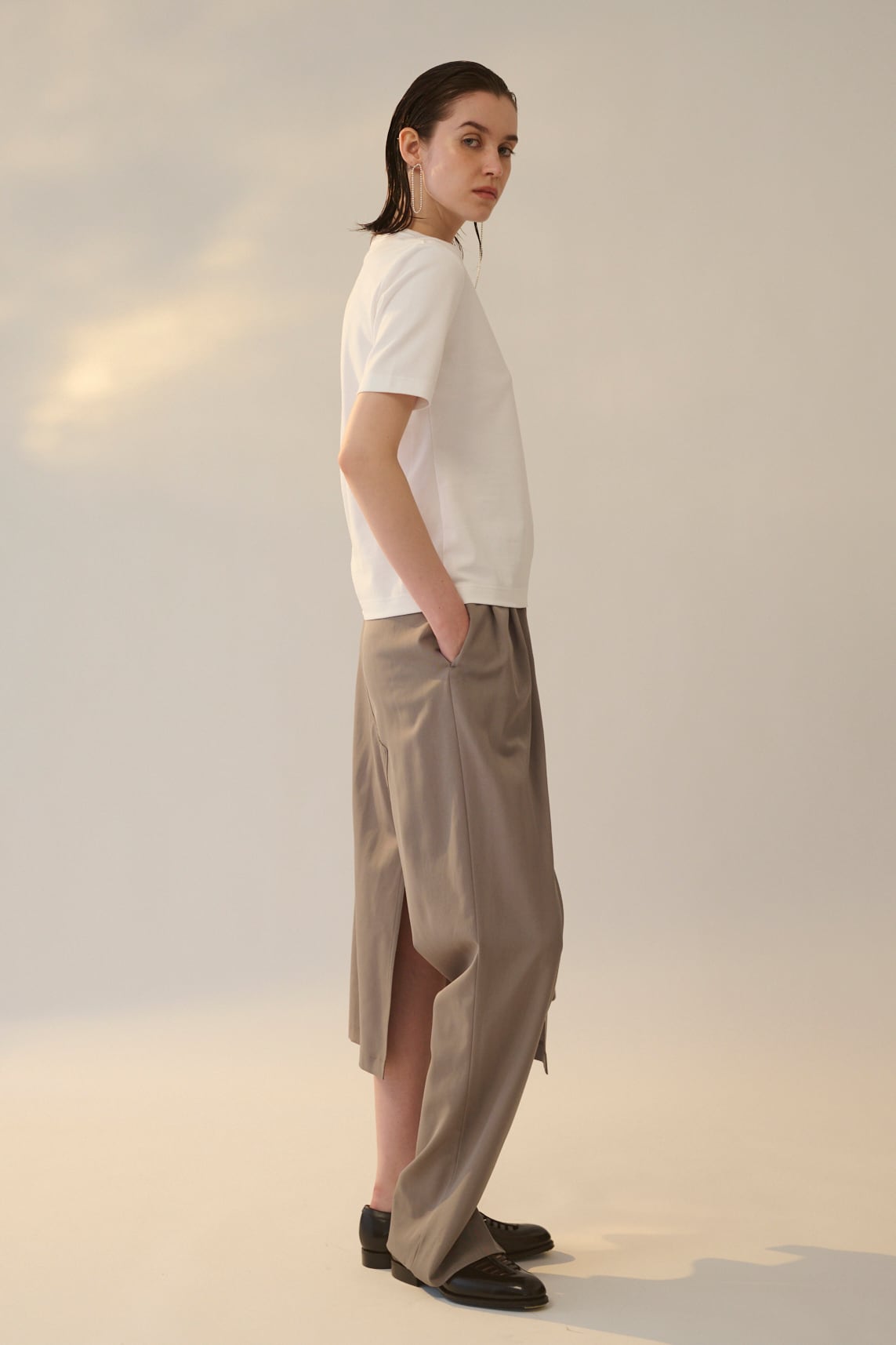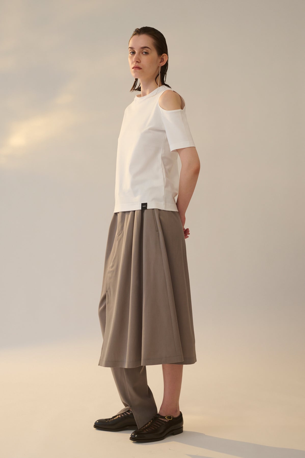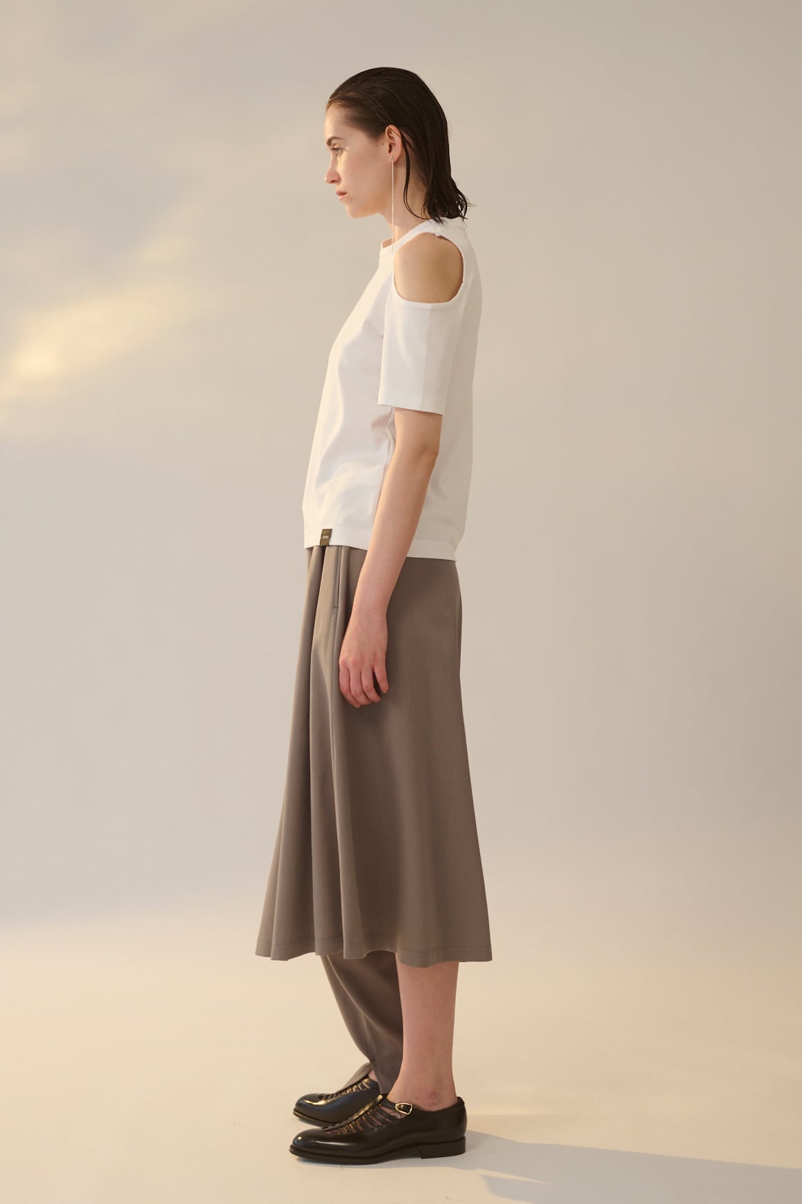 左肩をカーブにカットしたデザインがポイントのカットソーです。カッティングが際立つミニマルなデザインで日常に取り入れやすいバランスに仕上げました。