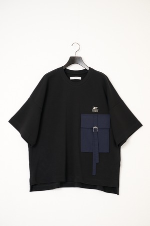 柔らかな肌触りのコットンダブルフェイス素材に異素材のベルト付きポケットが特徴のデザインです。
