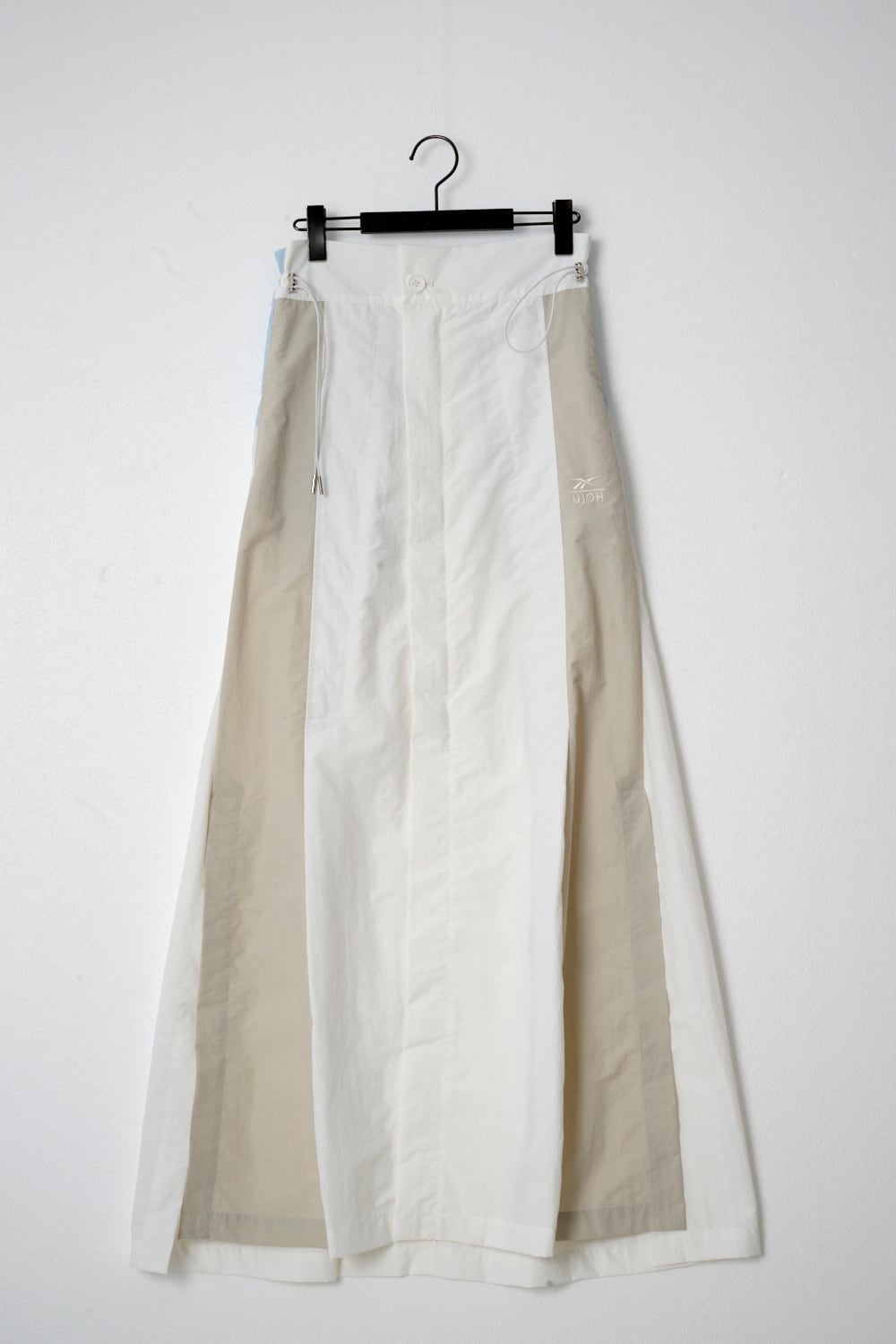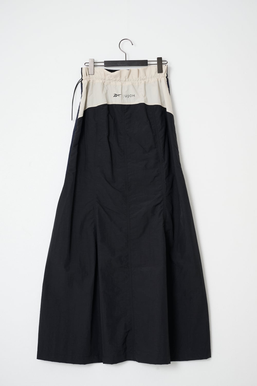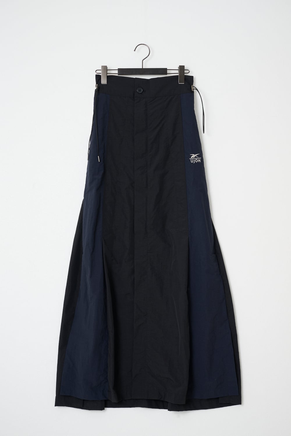 UJOH × Reebok のコラボレーションのスカートです。スリットの入った造形的なスカートを軽量なタフタで仕立てました。ベクターロゴとUJOHロゴのダブルネーム入りです。