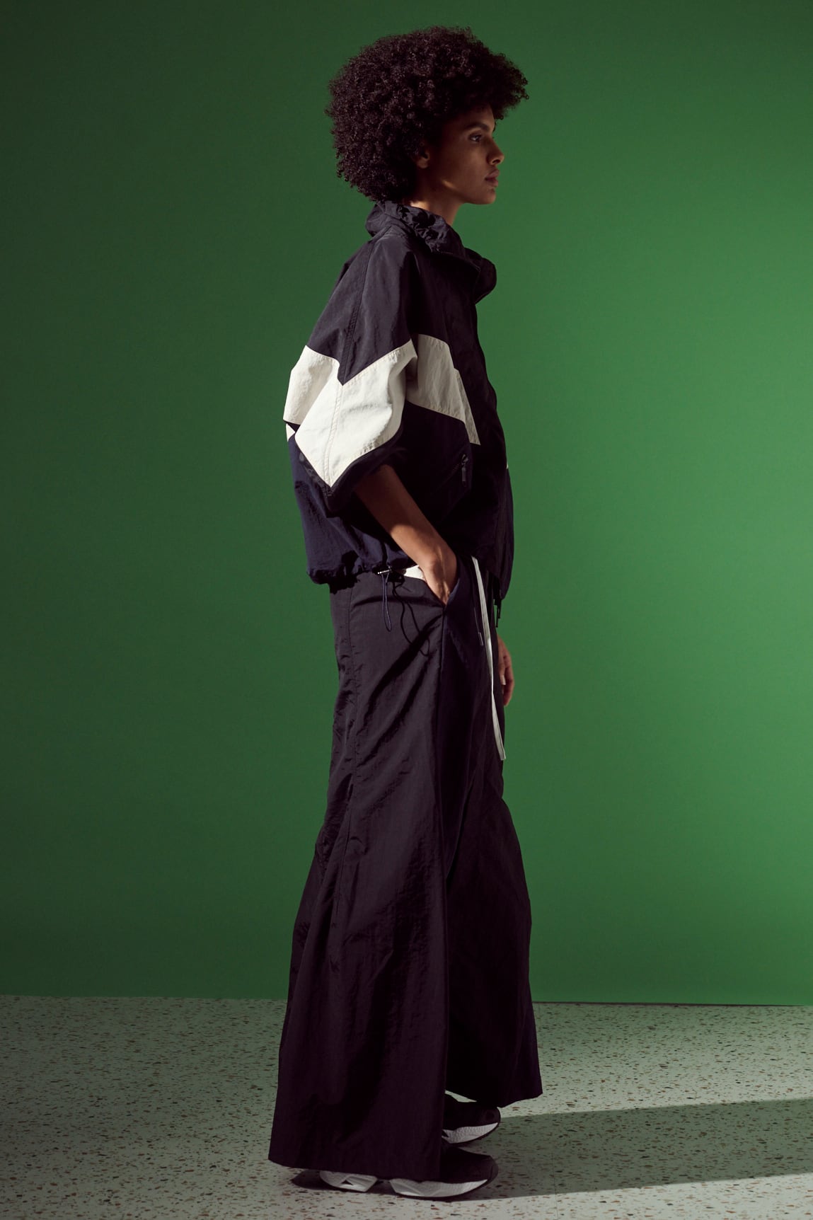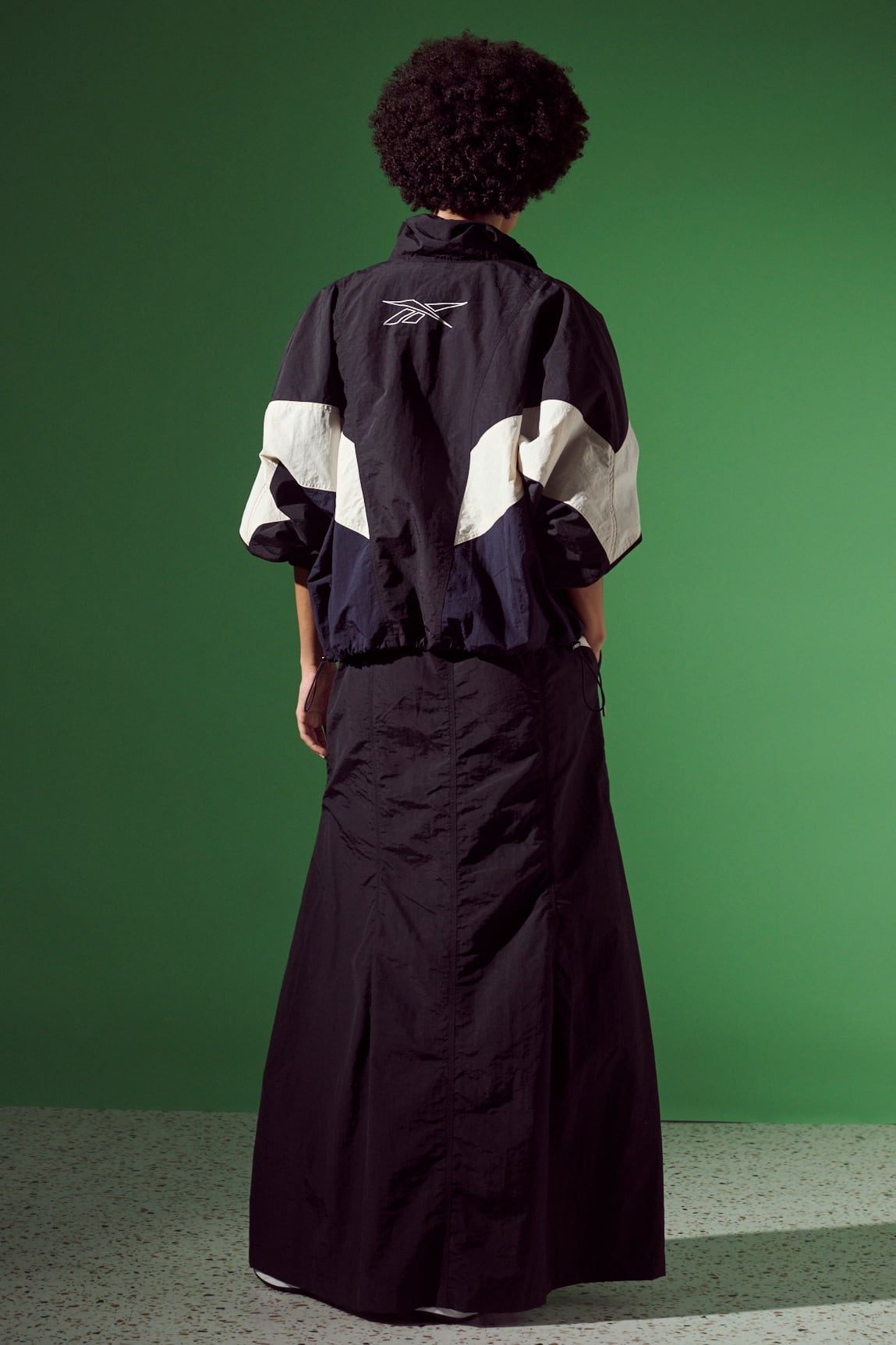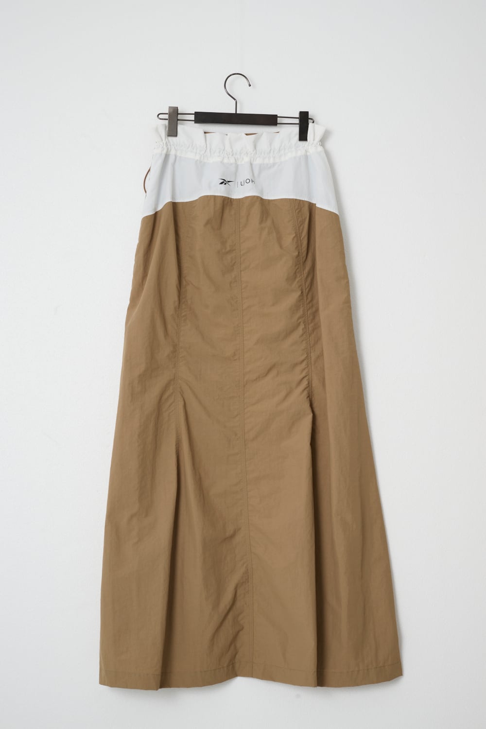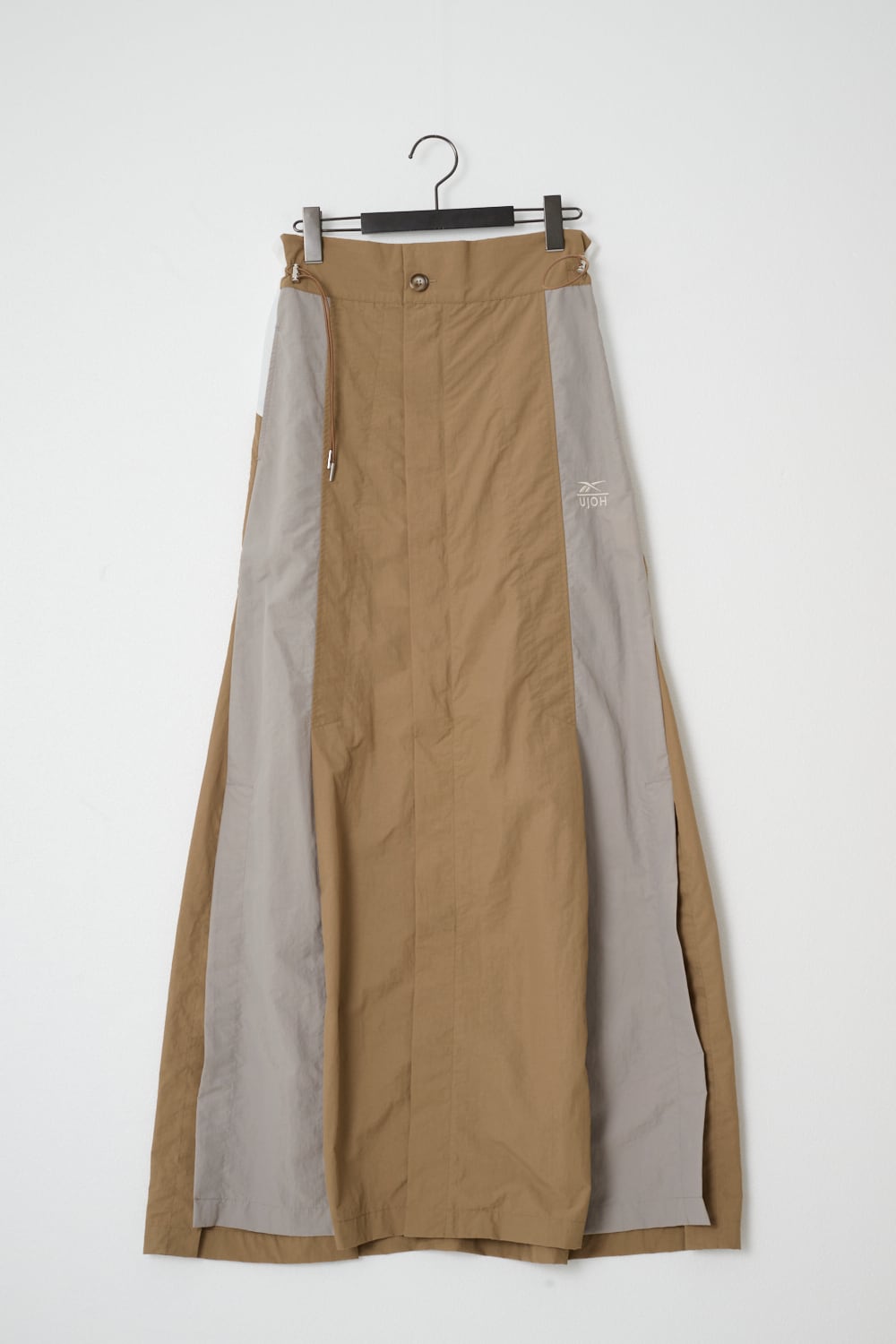UJOH × Reebok のコラボレーションのスカートです。スリットの入った造形的なスカートを軽量なタフタで仕立てました。ベクターロゴとUJOHロゴのダブルネーム入りです。
