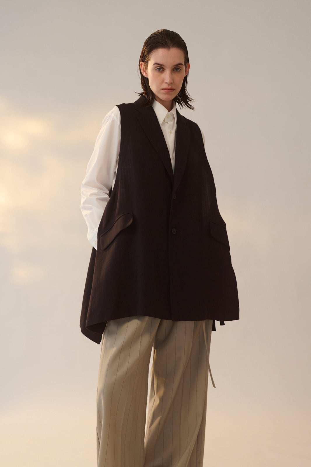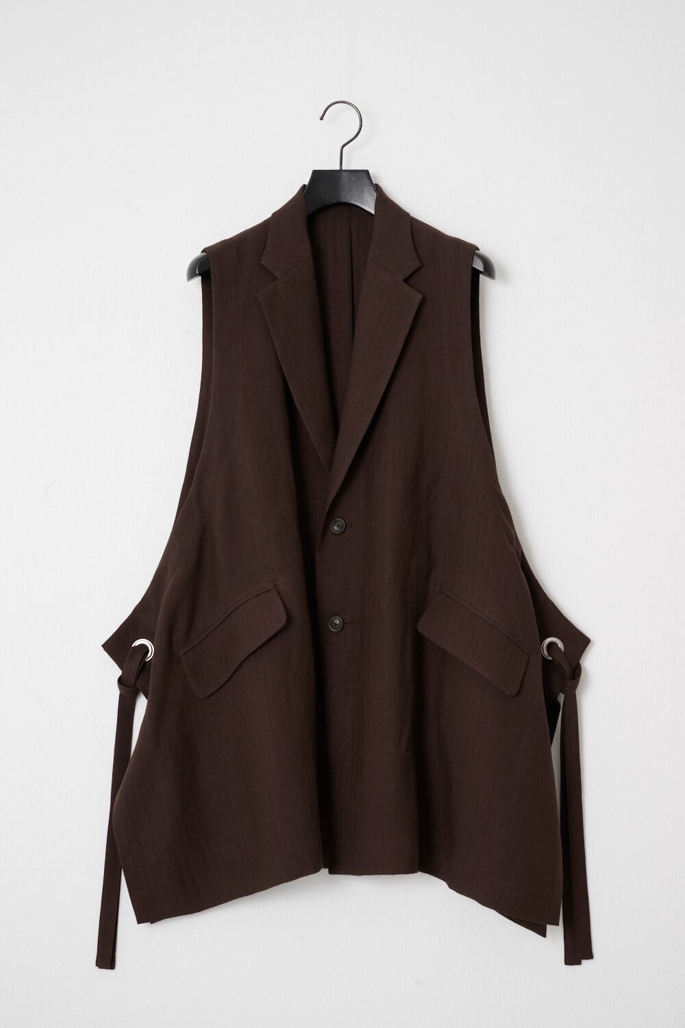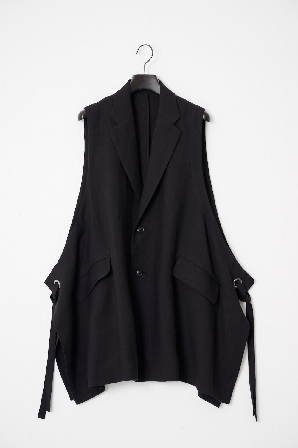 ノッチドラペルジャケットをベースに大胆にカットした身頃が特徴のベストです。脇についたハトメと共布テープがアクセントになっています。