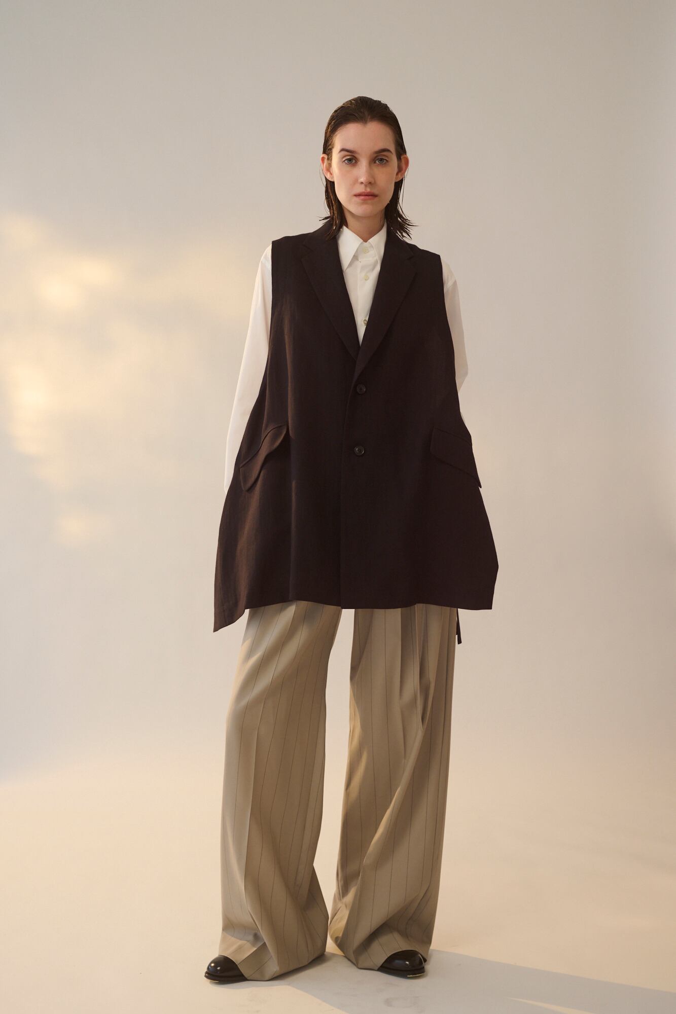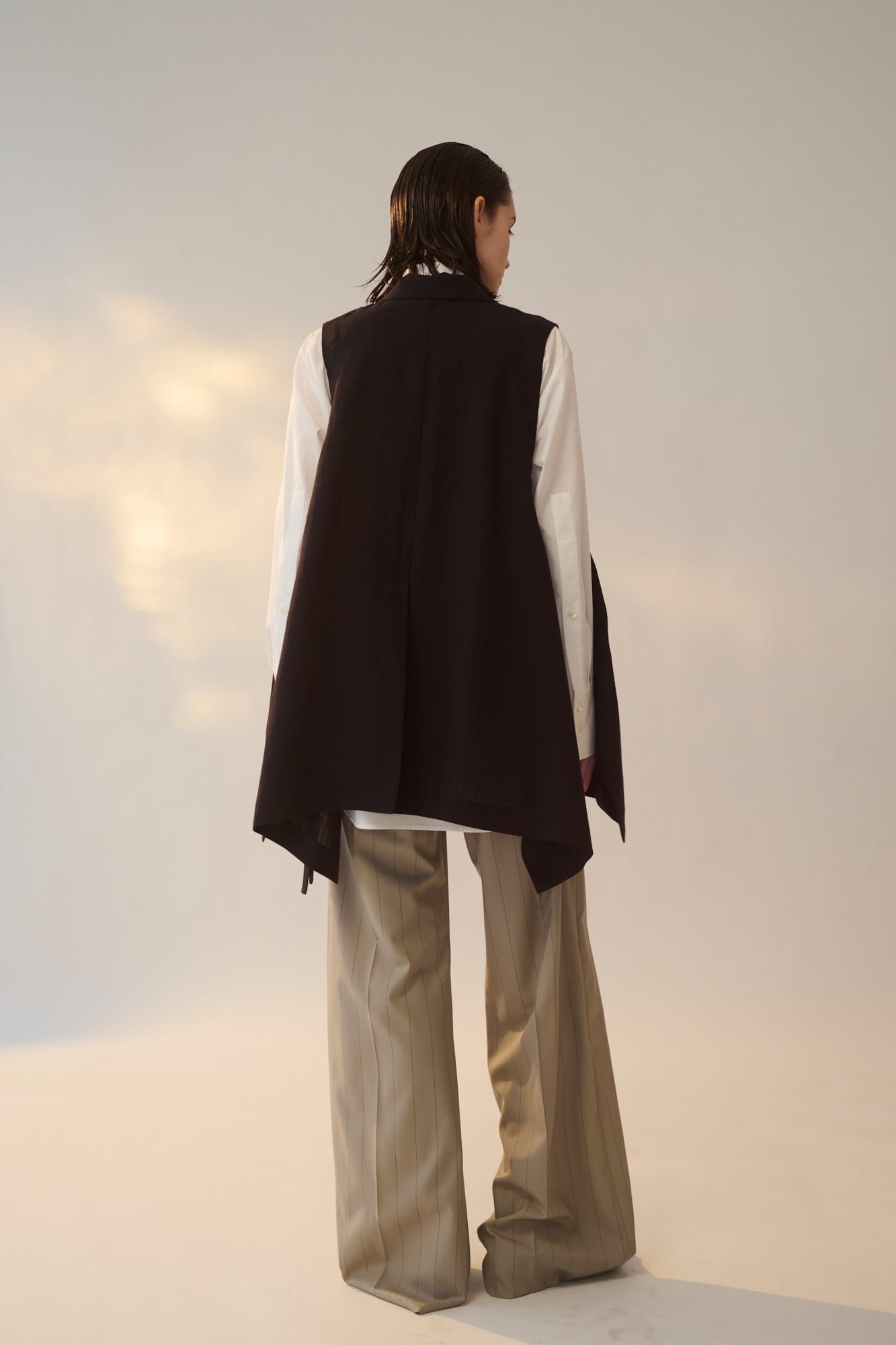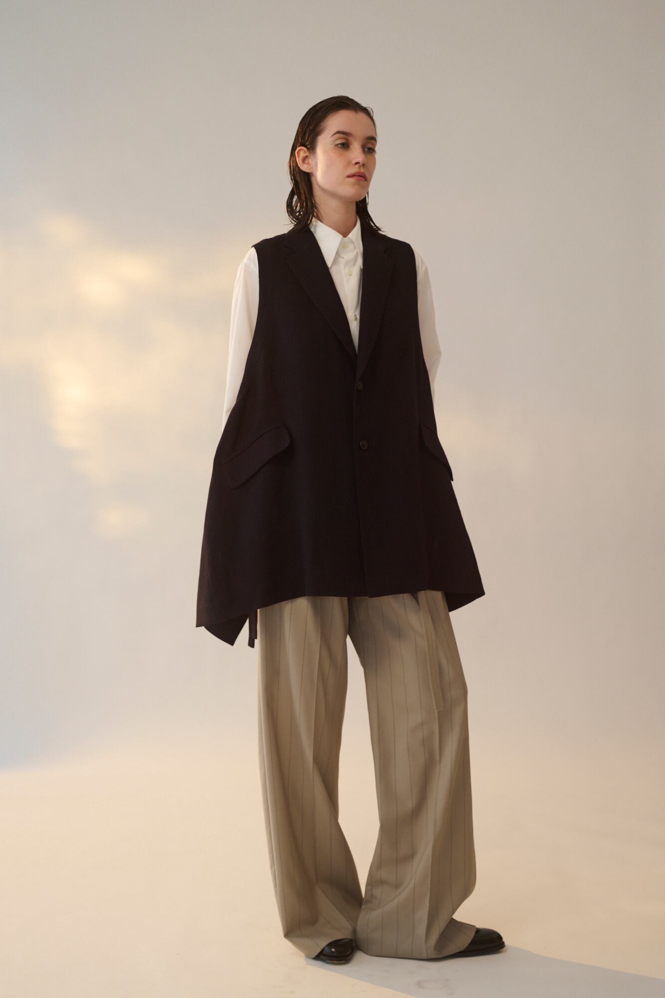 ノッチドラペルジャケットをベースに大胆にカットした身頃が特徴のベストです。脇についたハトメと共布テープがアクセントになっています。