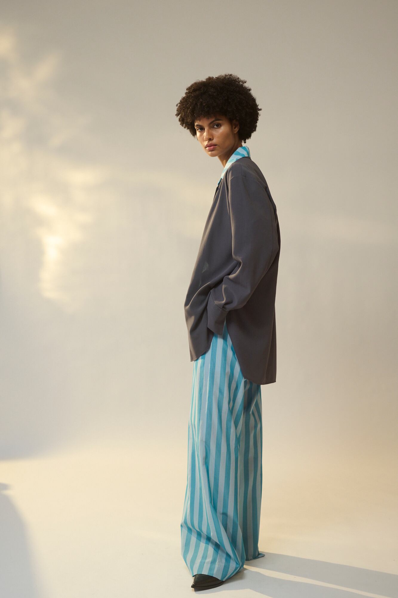 後染め、整理⼯程を施すことにより強撚⽷のシャリ感を残しつつ、レーヨンの柔らかさも感じられるシアー素材です。