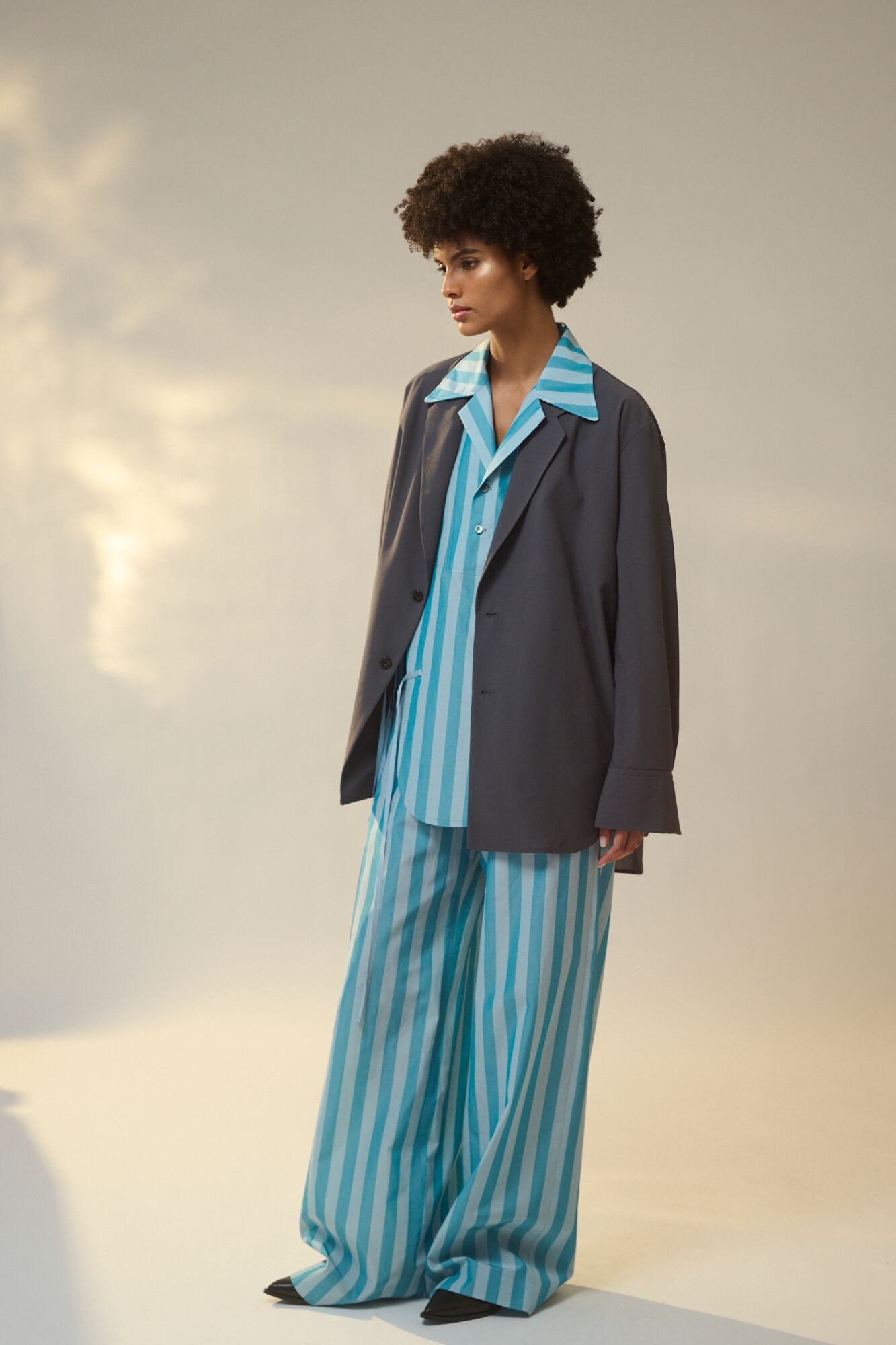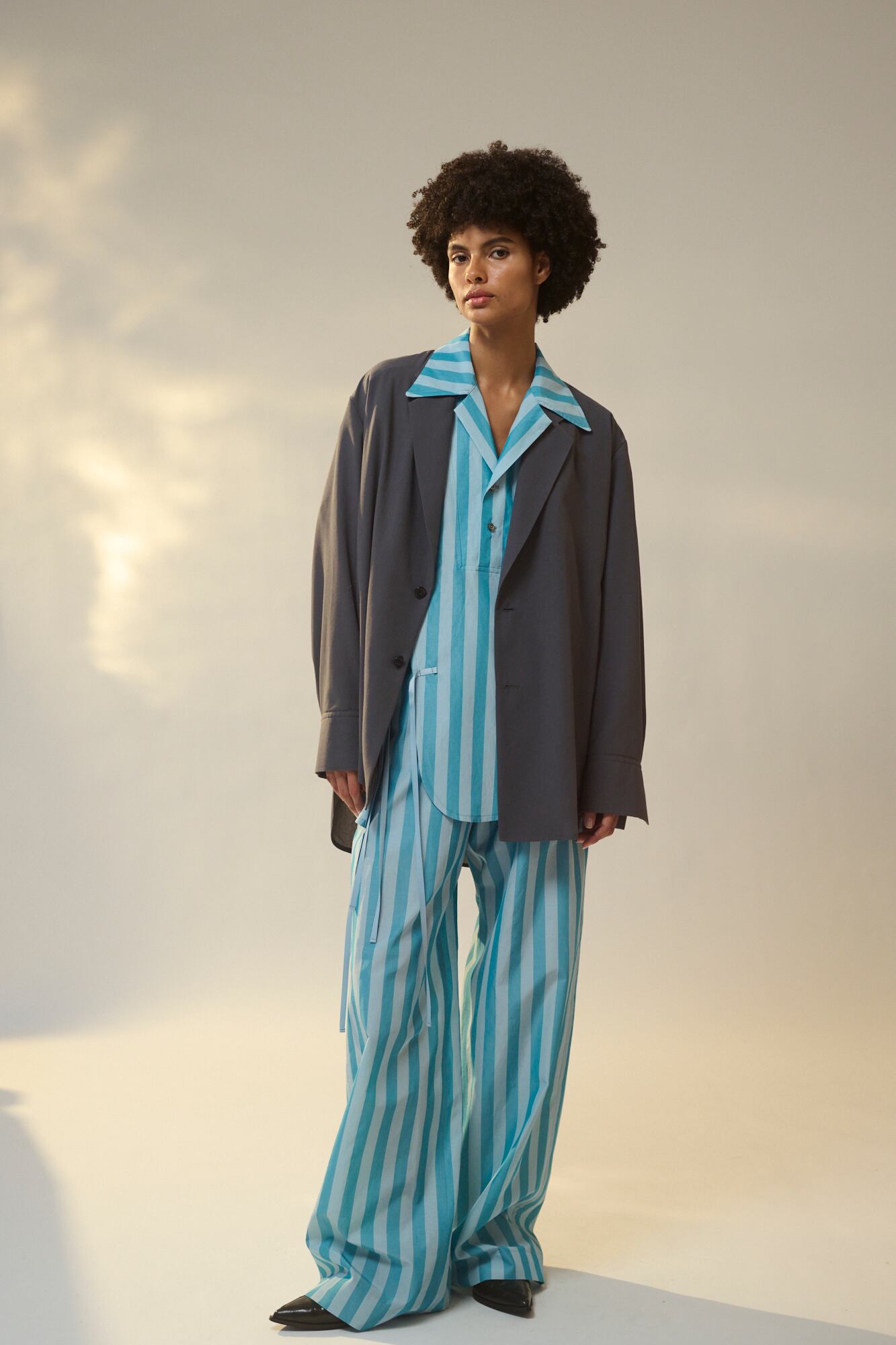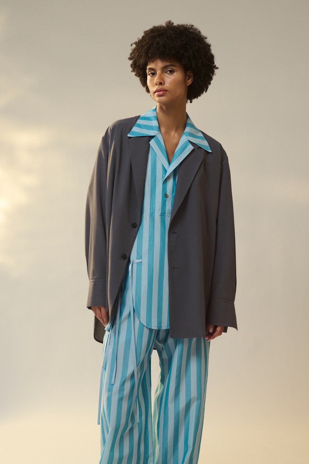 ジャケットライクなテーラードカラーを⽣かしたミニマルなデザインです。