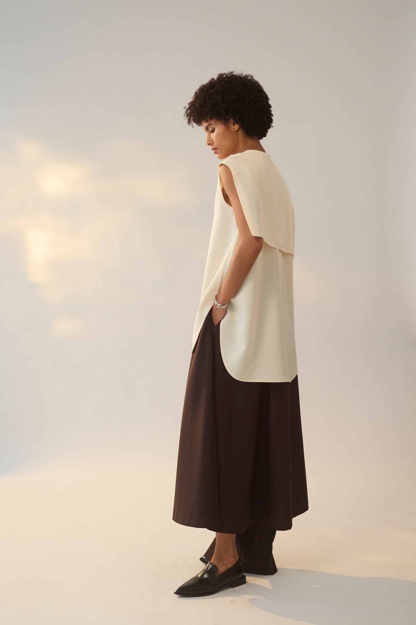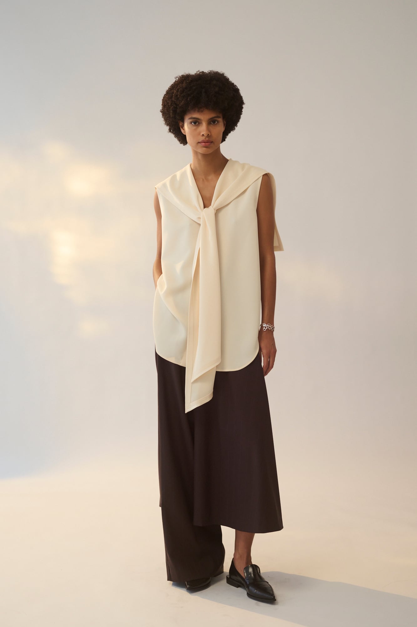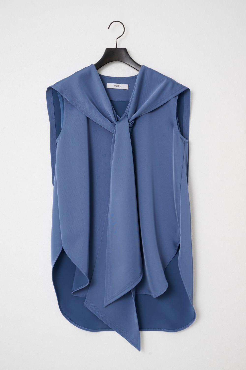 大きなセーラーカラーが印象的なノースリーブシャツです。セーラーデザインでありながらすっきりとしたシルエットで甘くなりすぎない大人なバランスに仕上げました。