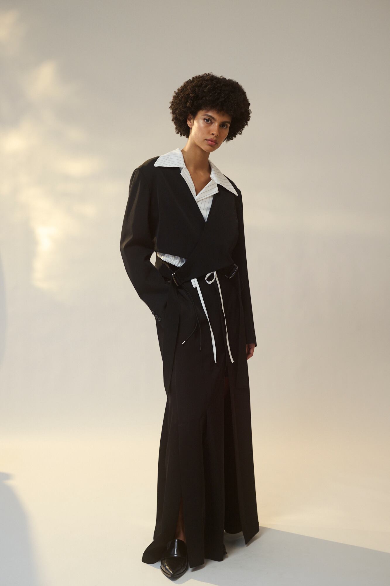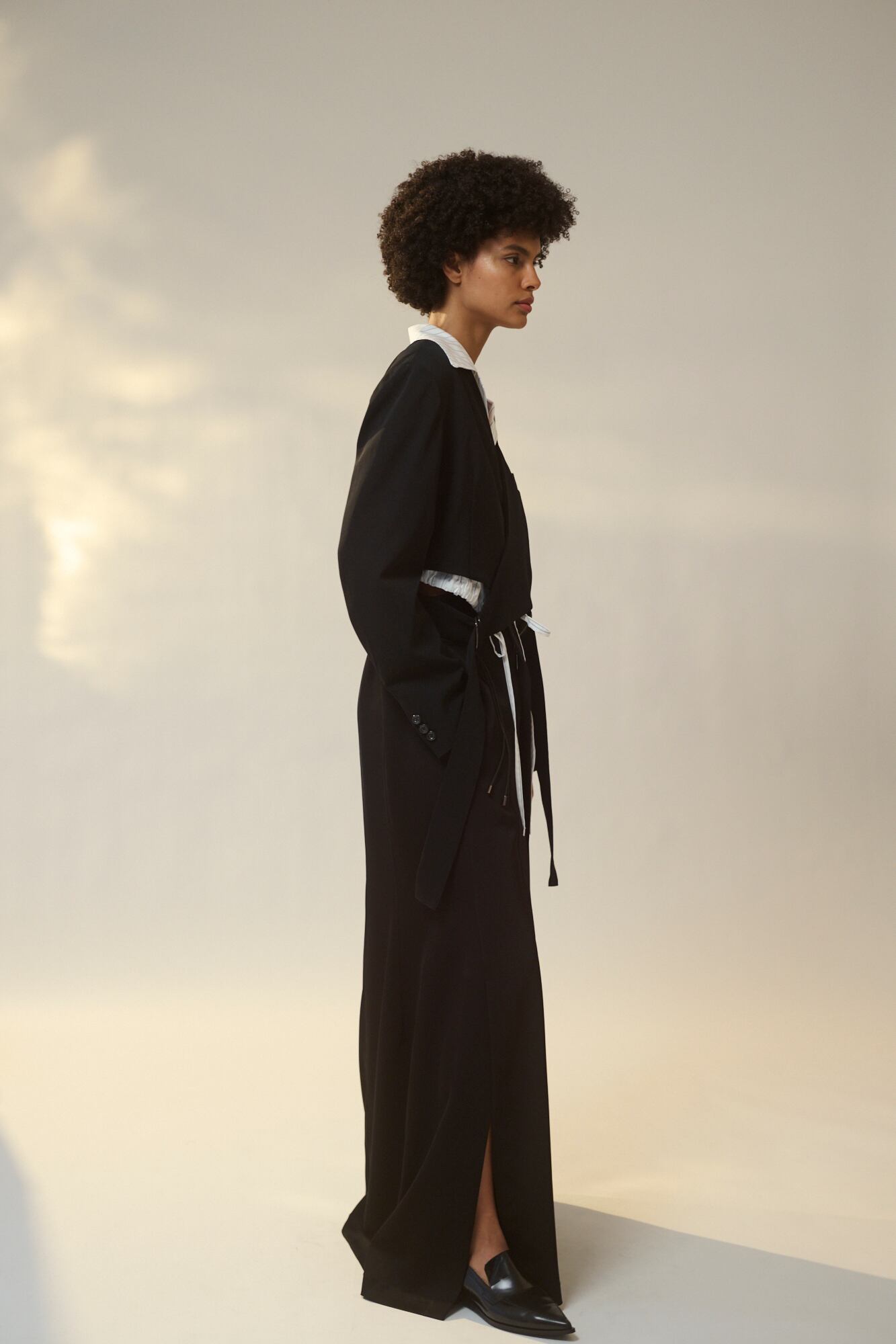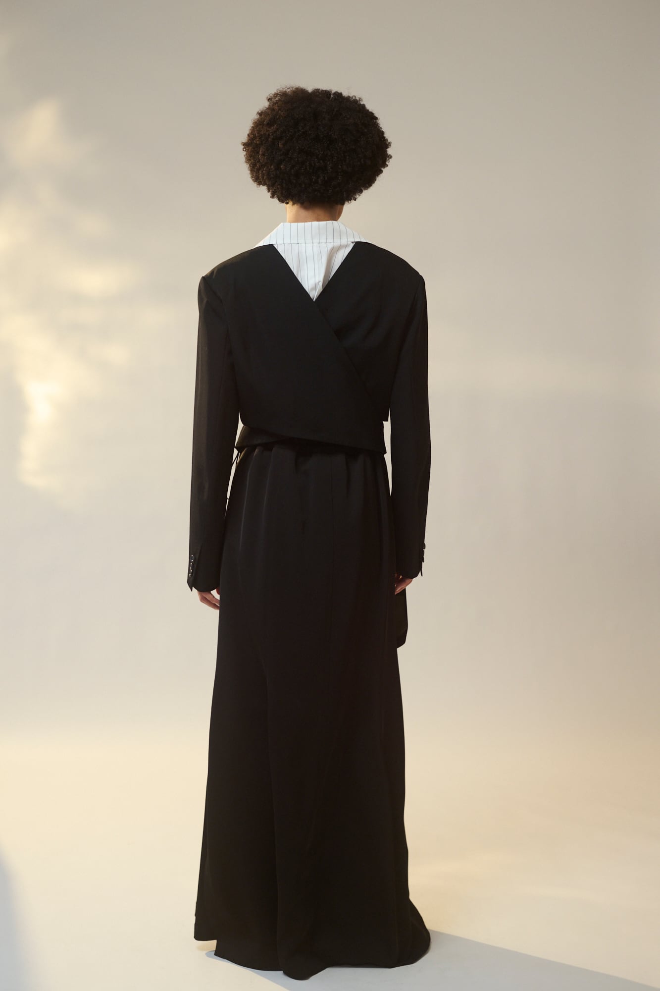 日常のワードローブに取り入れやすアイテムでありながら造形的なシルエットを美しく保つように設計されています。後ろウエストのゴムは調節可能です。