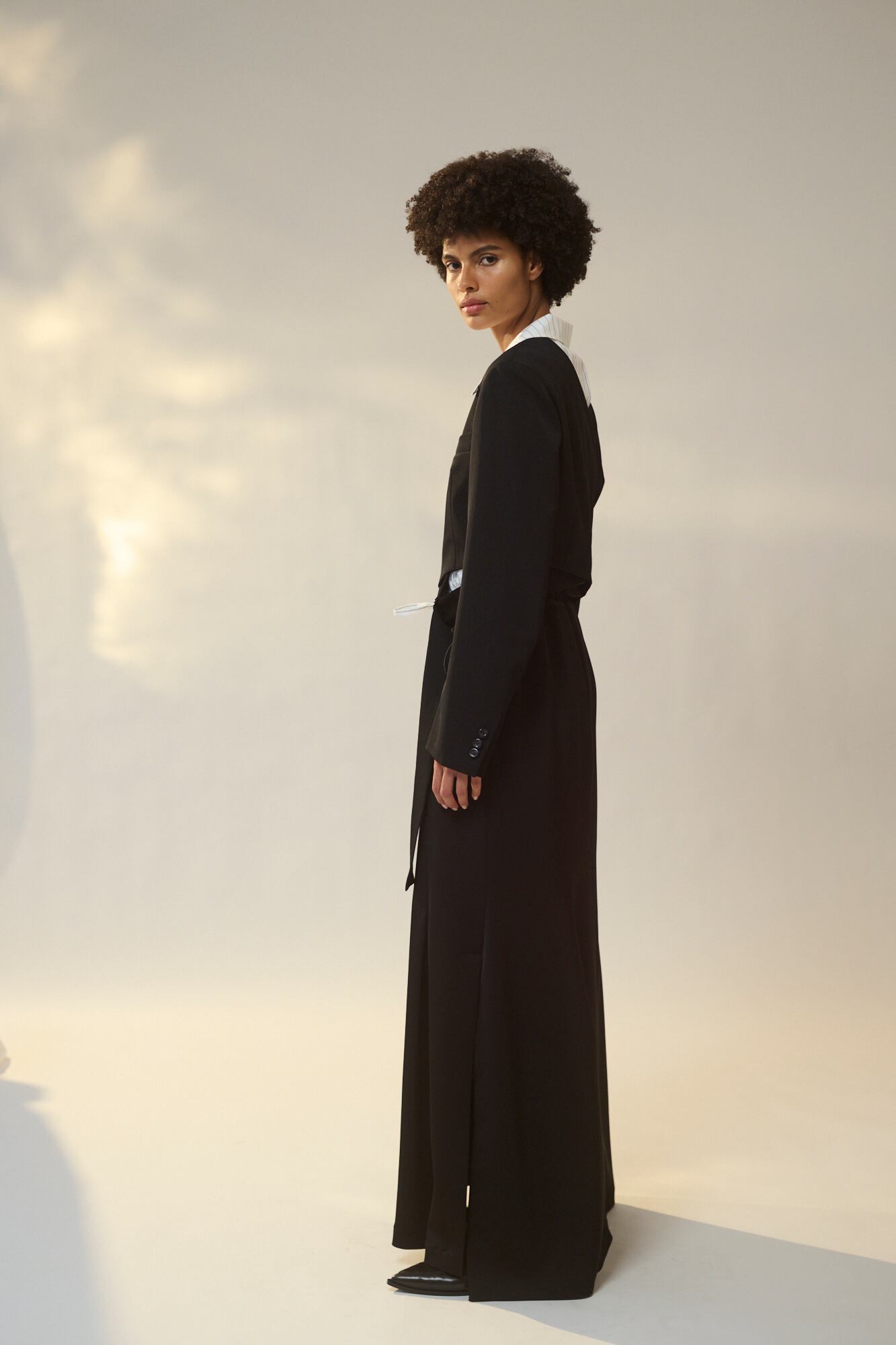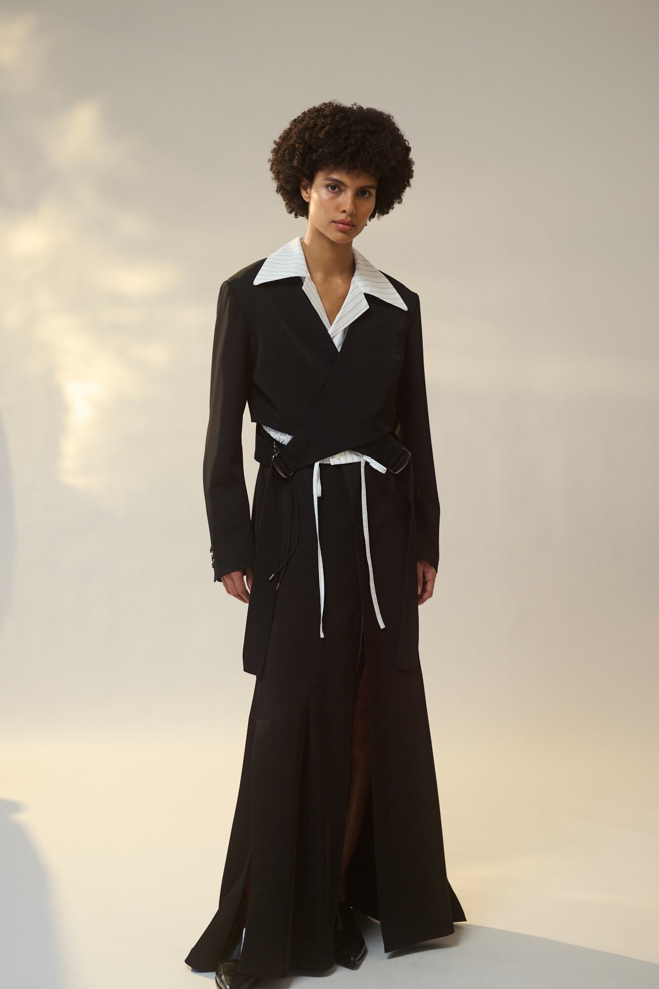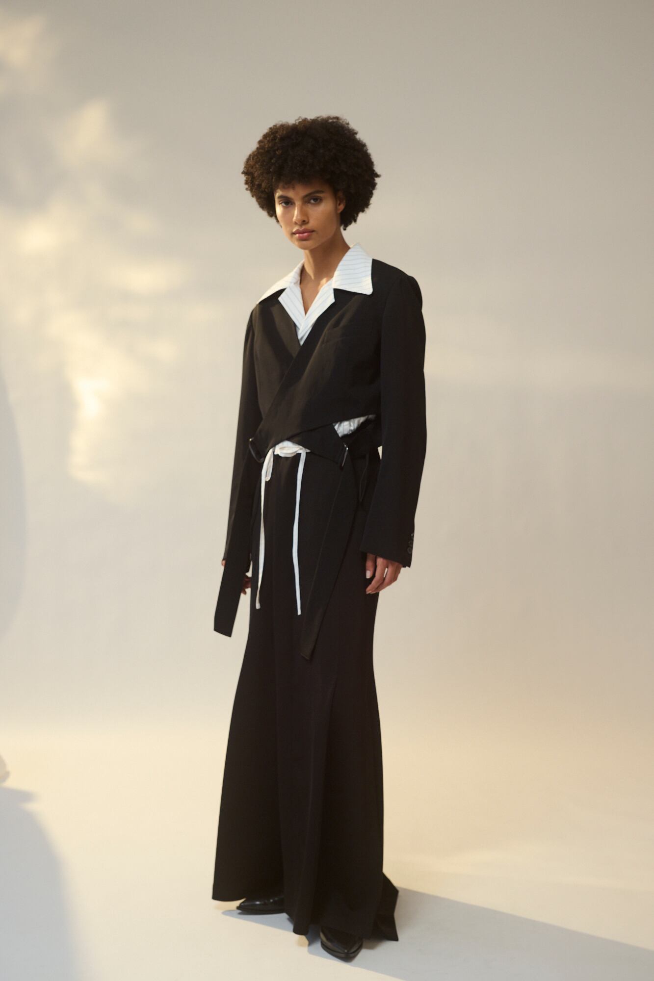 日常のワードローブに取り入れやすアイテムでありながら造形的なシルエットを美しく保つように設計されています。後ろウエストのゴムは調節可能です。