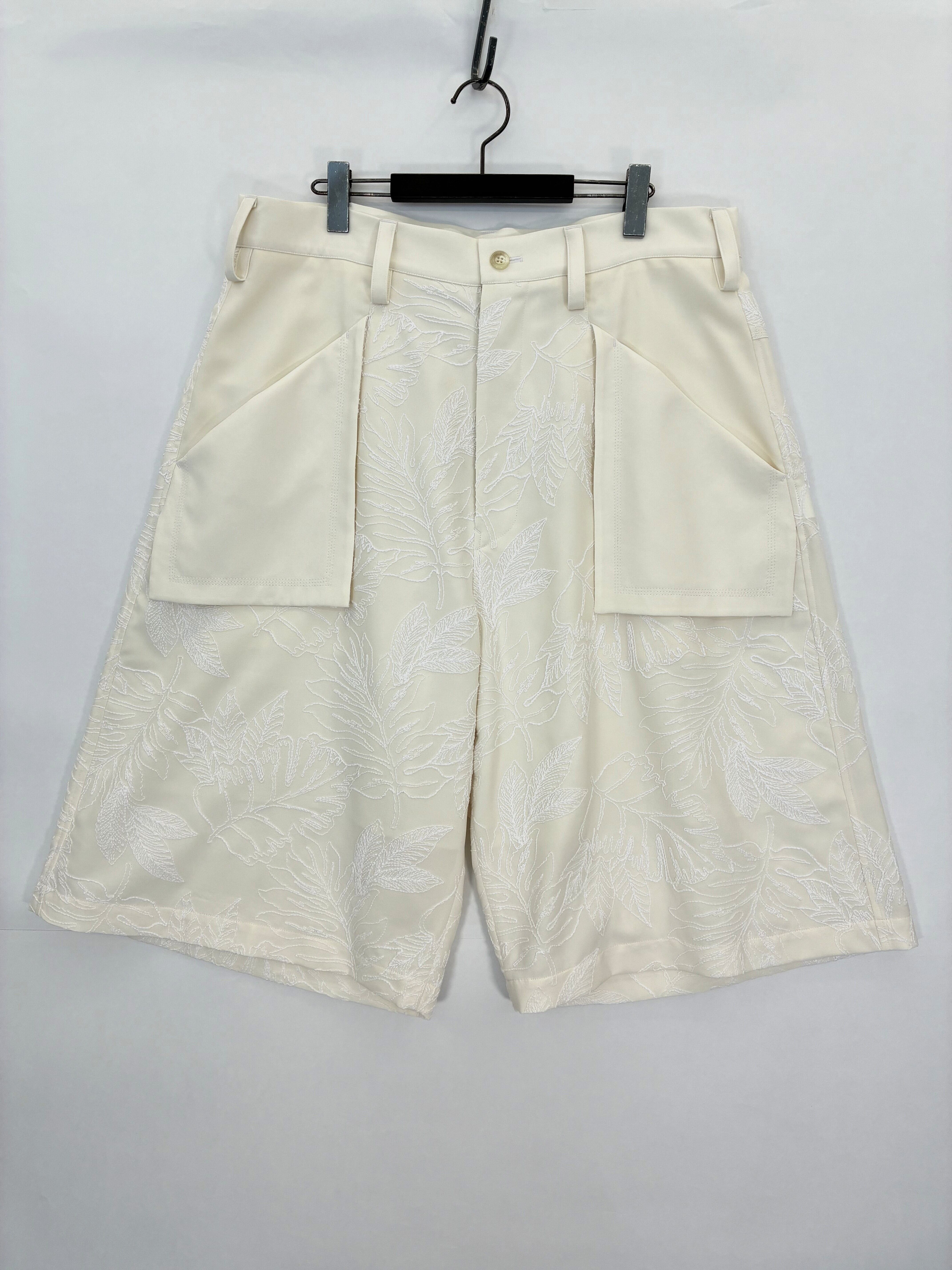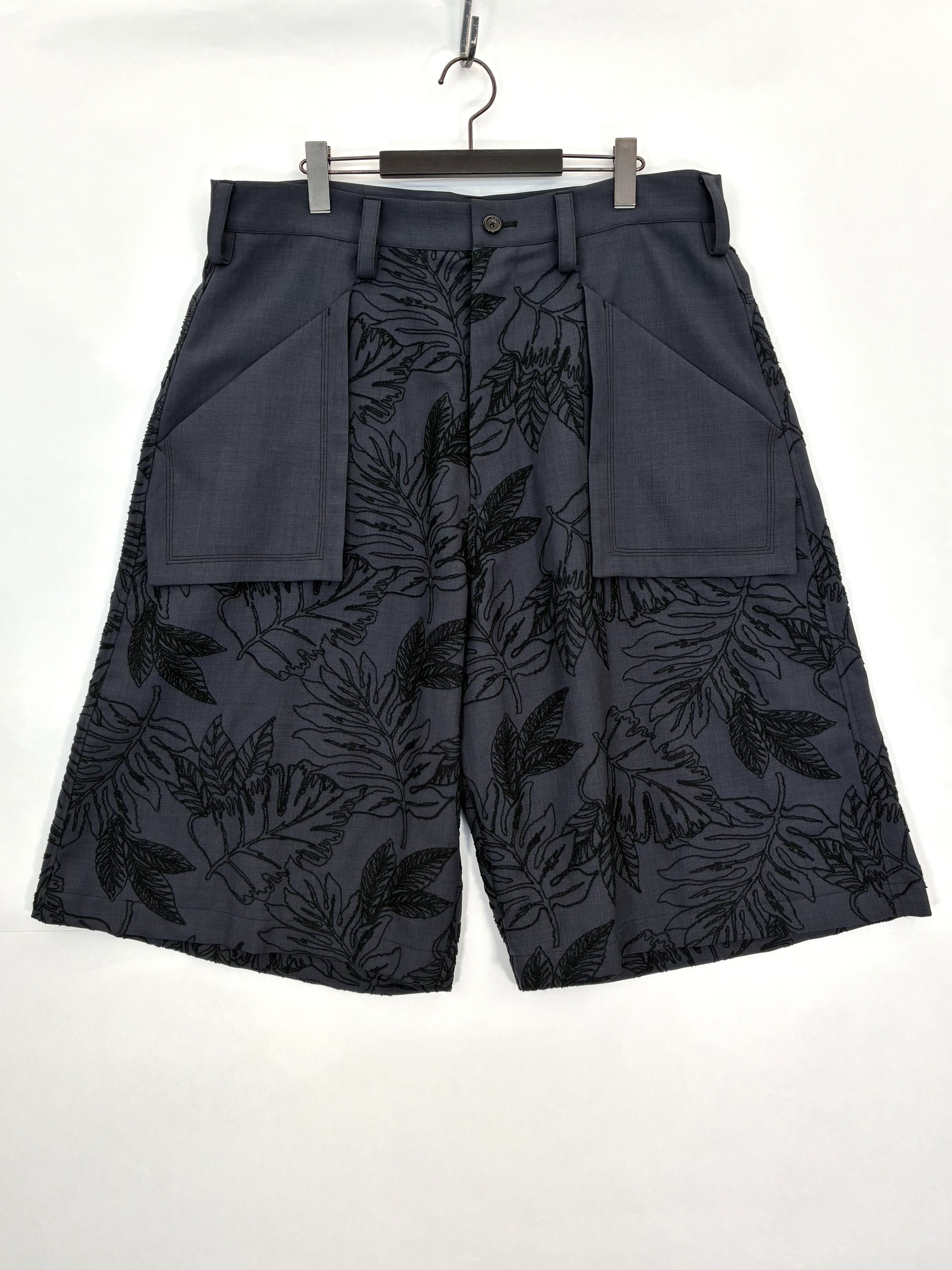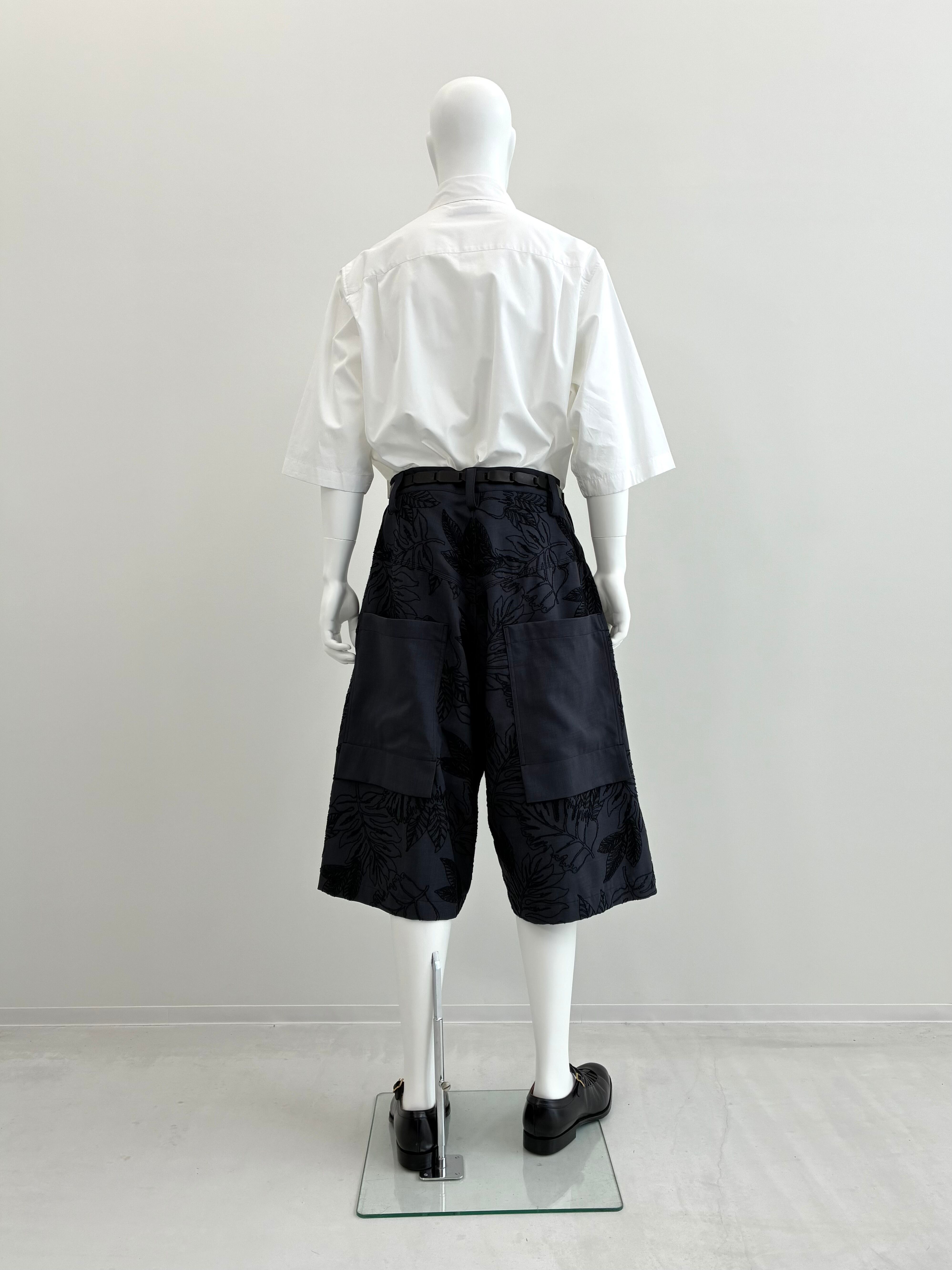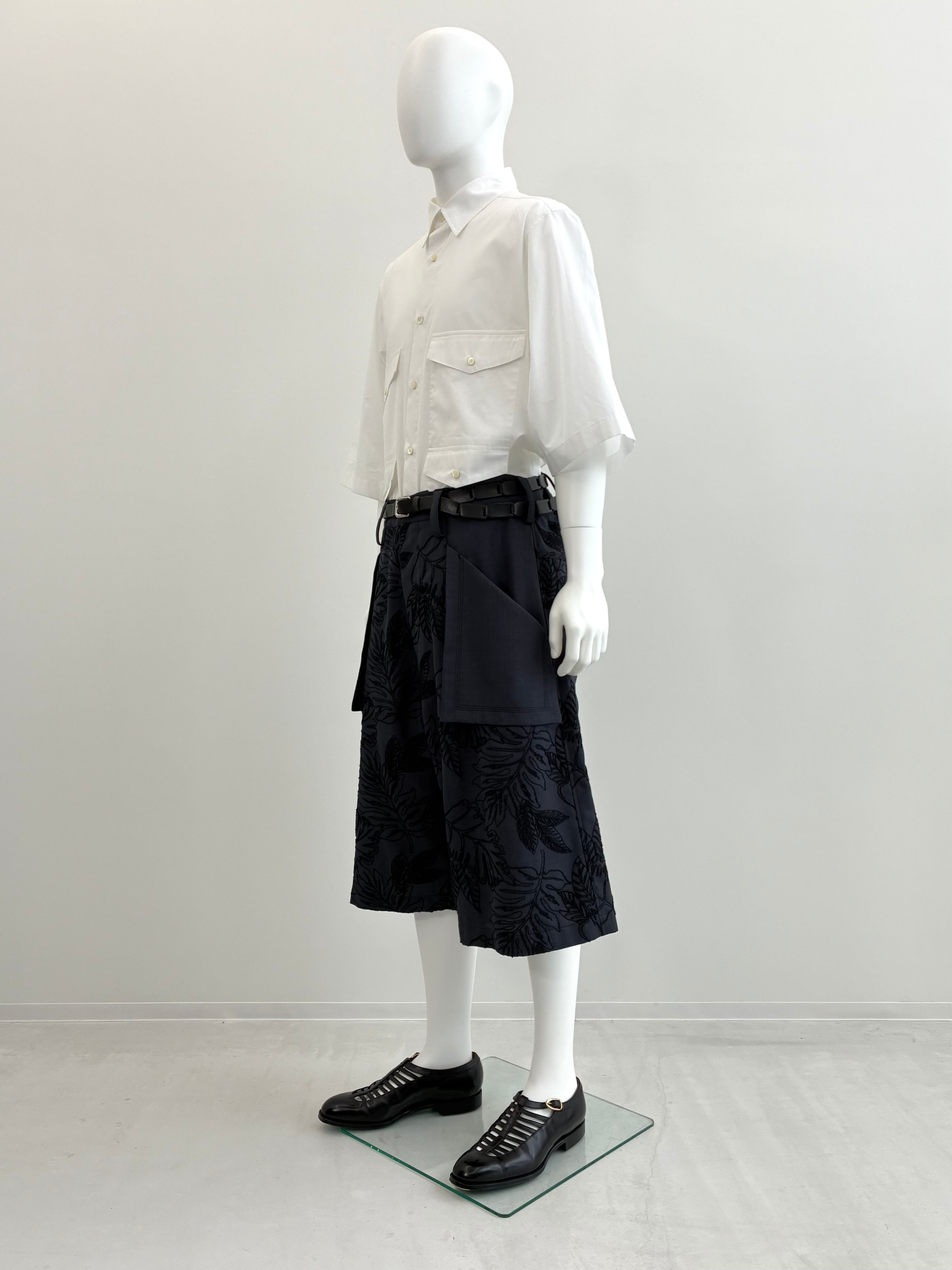 ワークパンツをベースにした膝下丈のフレアシルエットに、刺繍⽣地との組み合わせによるコントラスト、ステッチワークや⼤ぶりのヨークとアウトポケットがアクセントとなり、存在感のある⼀着に仕上げています。