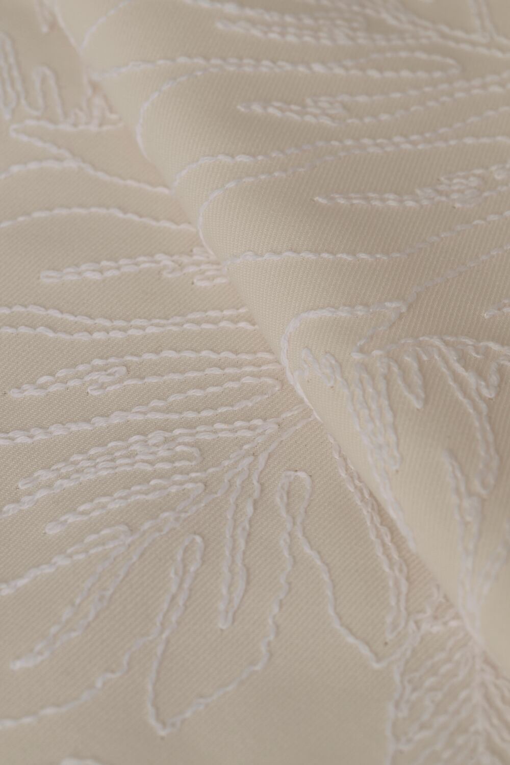 梳⽑調のポリエステルツイルにトロピカルリーフ柄を刺繍した⽣地です。
