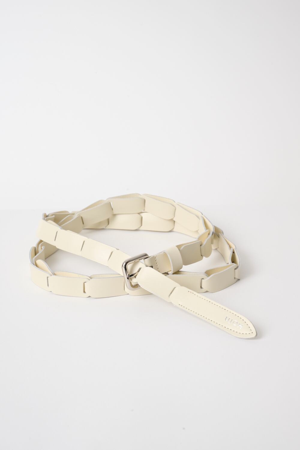 ファッショングッズブランドLIWLEとのコラボレーションです。 上質なガラス仕上げのステアレザーを採⽤しています。 ⽳の開いた同じ形状のパーツを連結させた鎖状のベルトです。 全ての⽳にバックルのピンが通せるので、⾃在にサイズ調節が可能です。