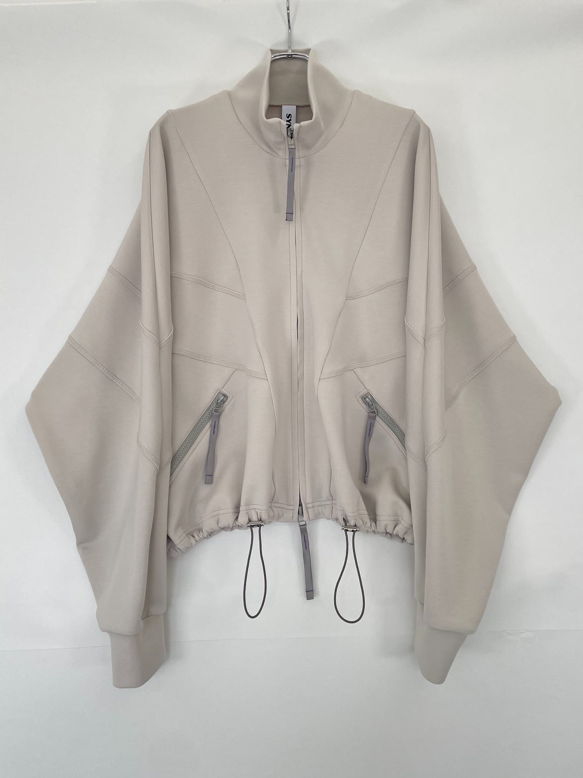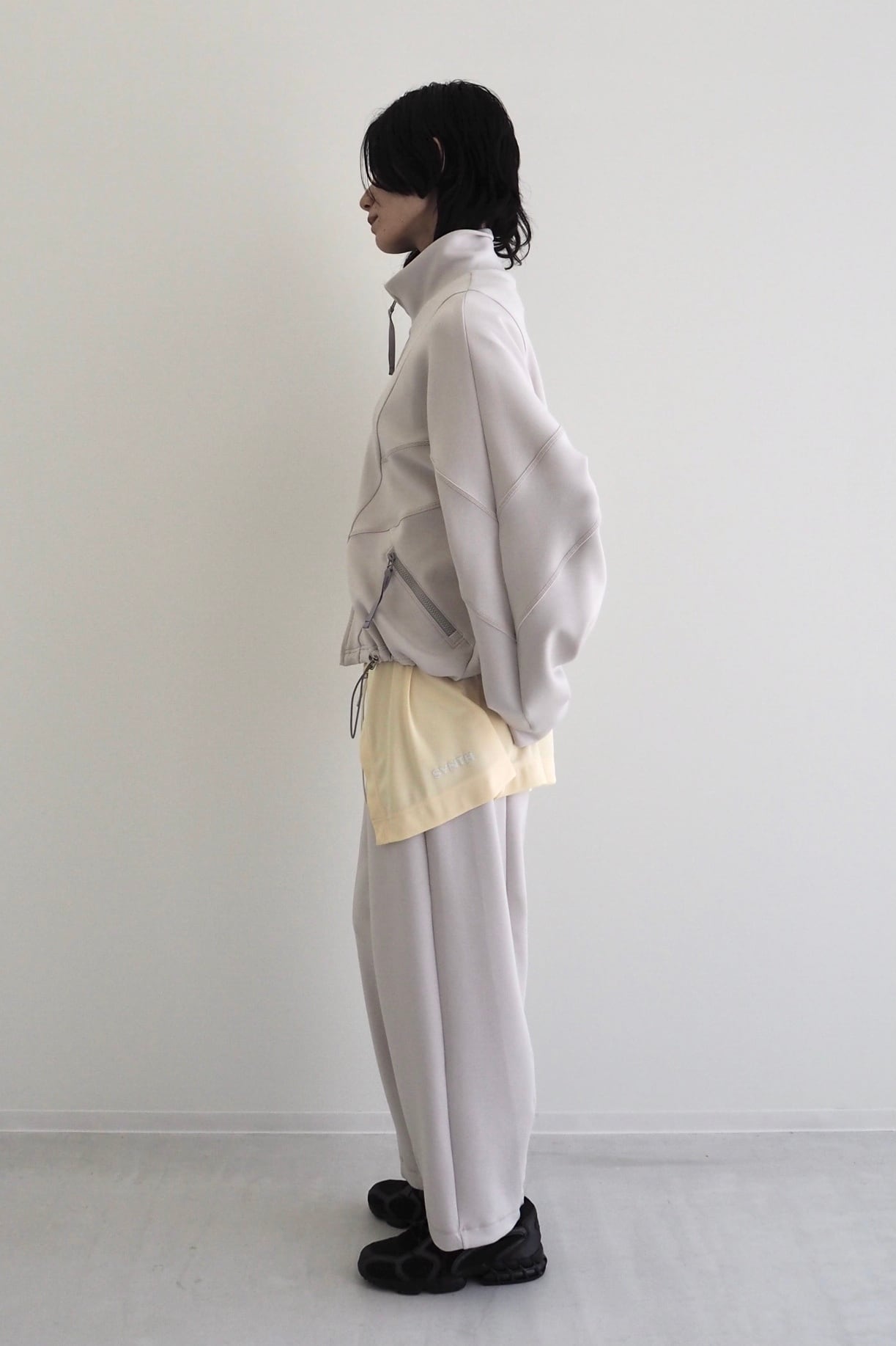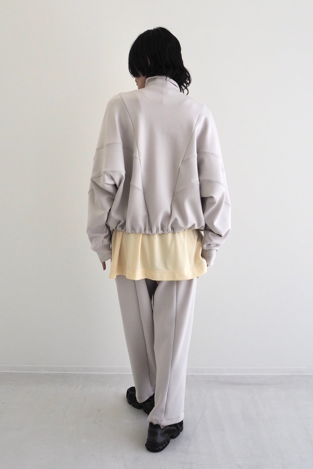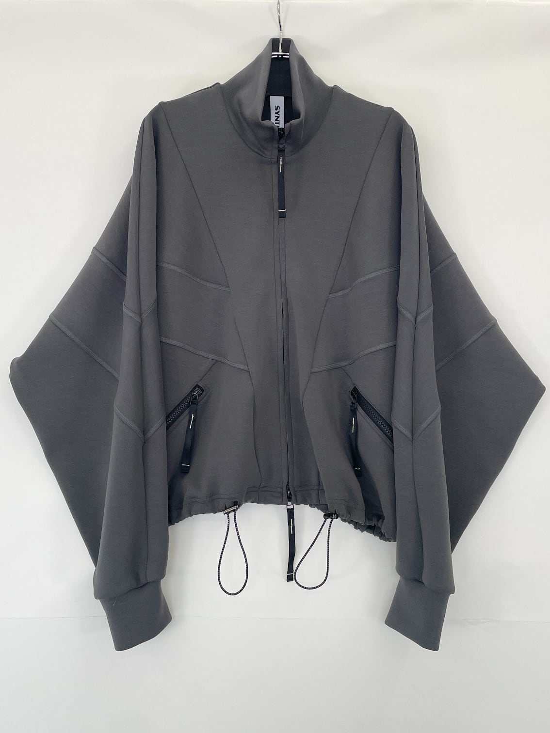 肩まわりを包み込むようなドルマンスリーブとシャープなカッティングが、アクティブな動きにも対応しながら、存在感のあるシルエットになっています。