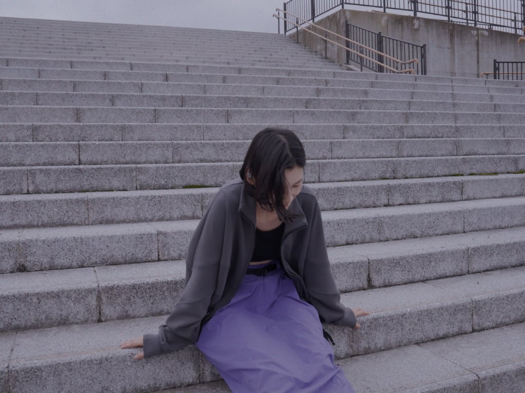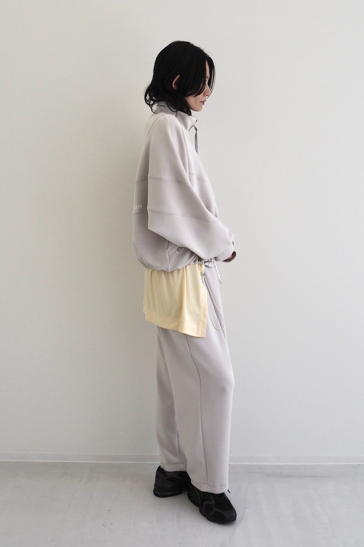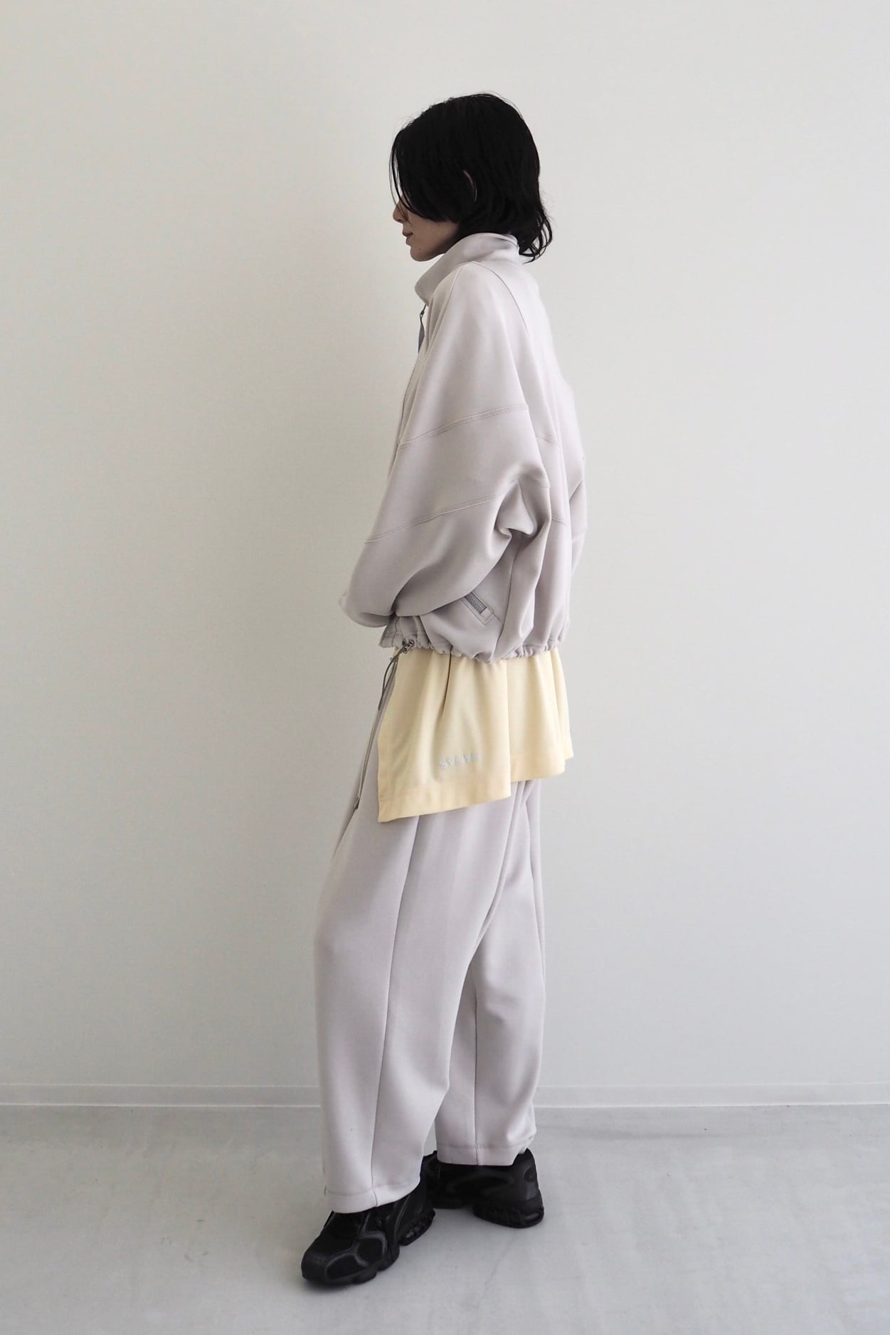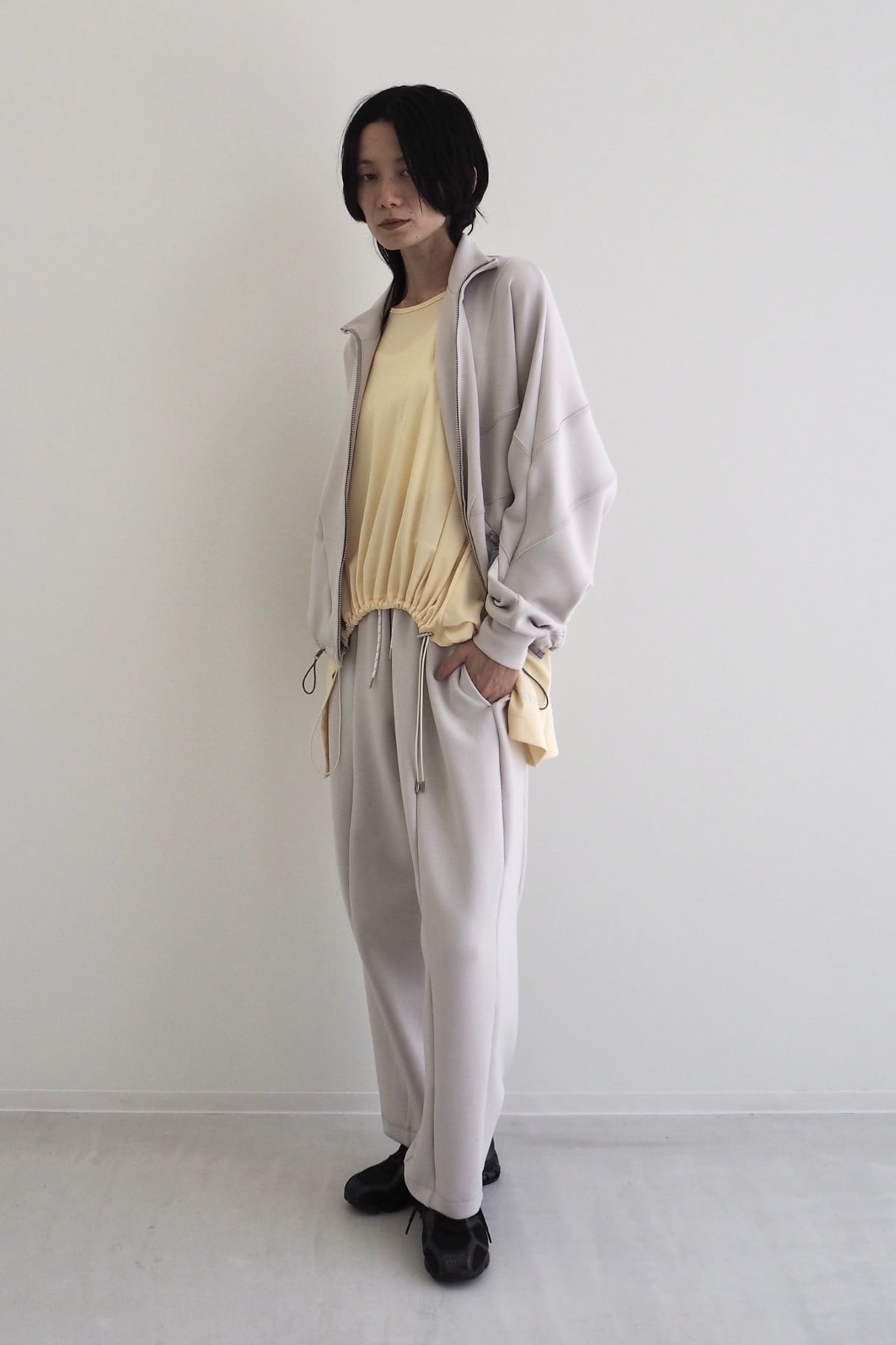 肩まわりを包み込むようなドルマンスリーブとシャープなカッティングが、アクティブな動きにも対応しながら、存在感のあるシルエットになっています。