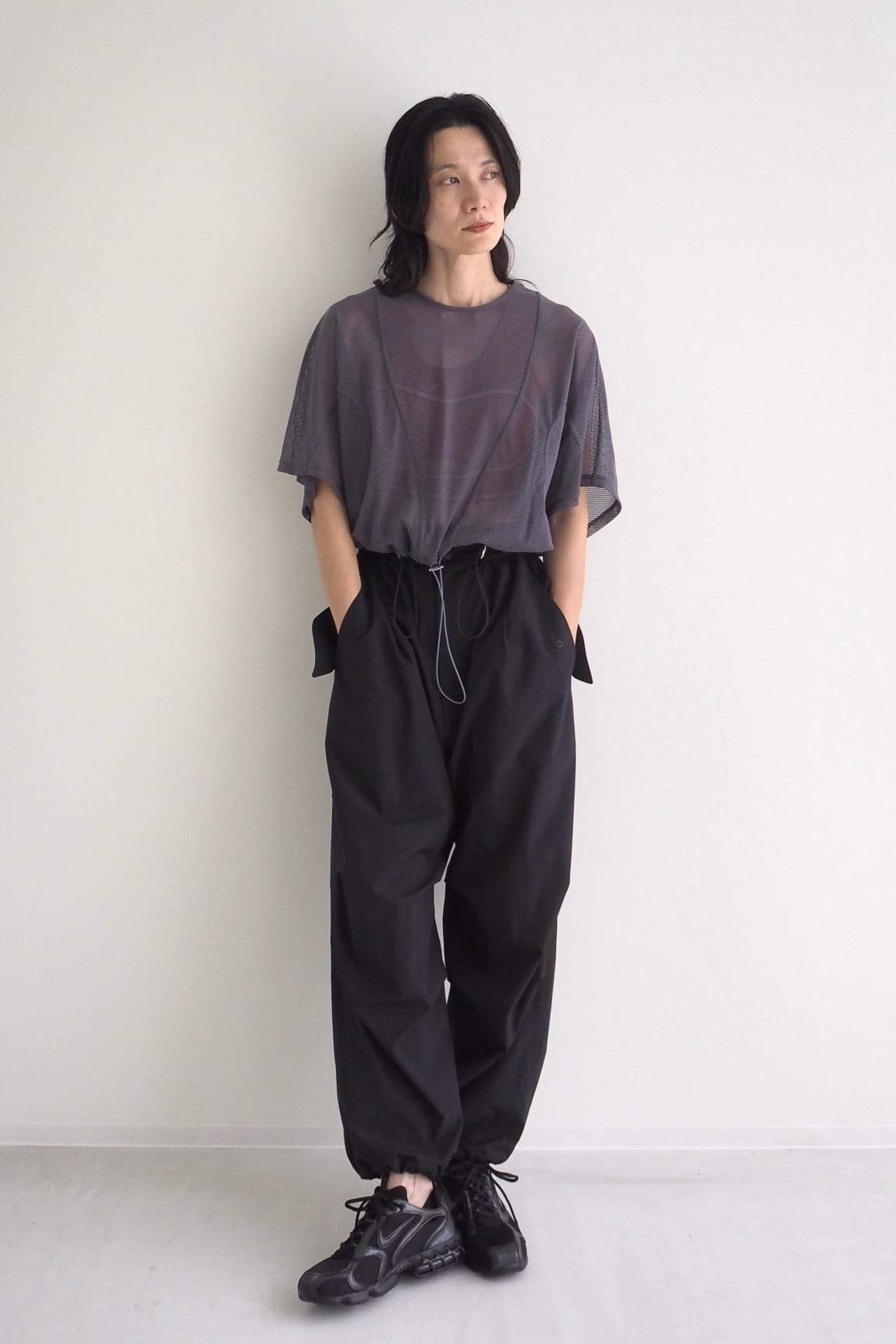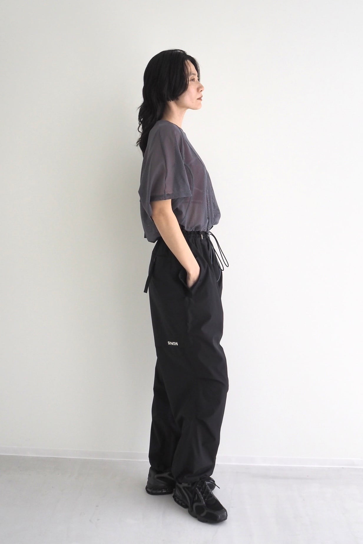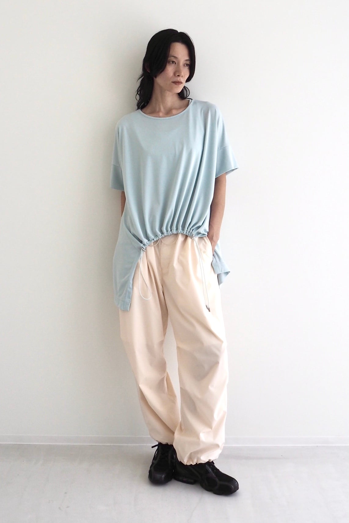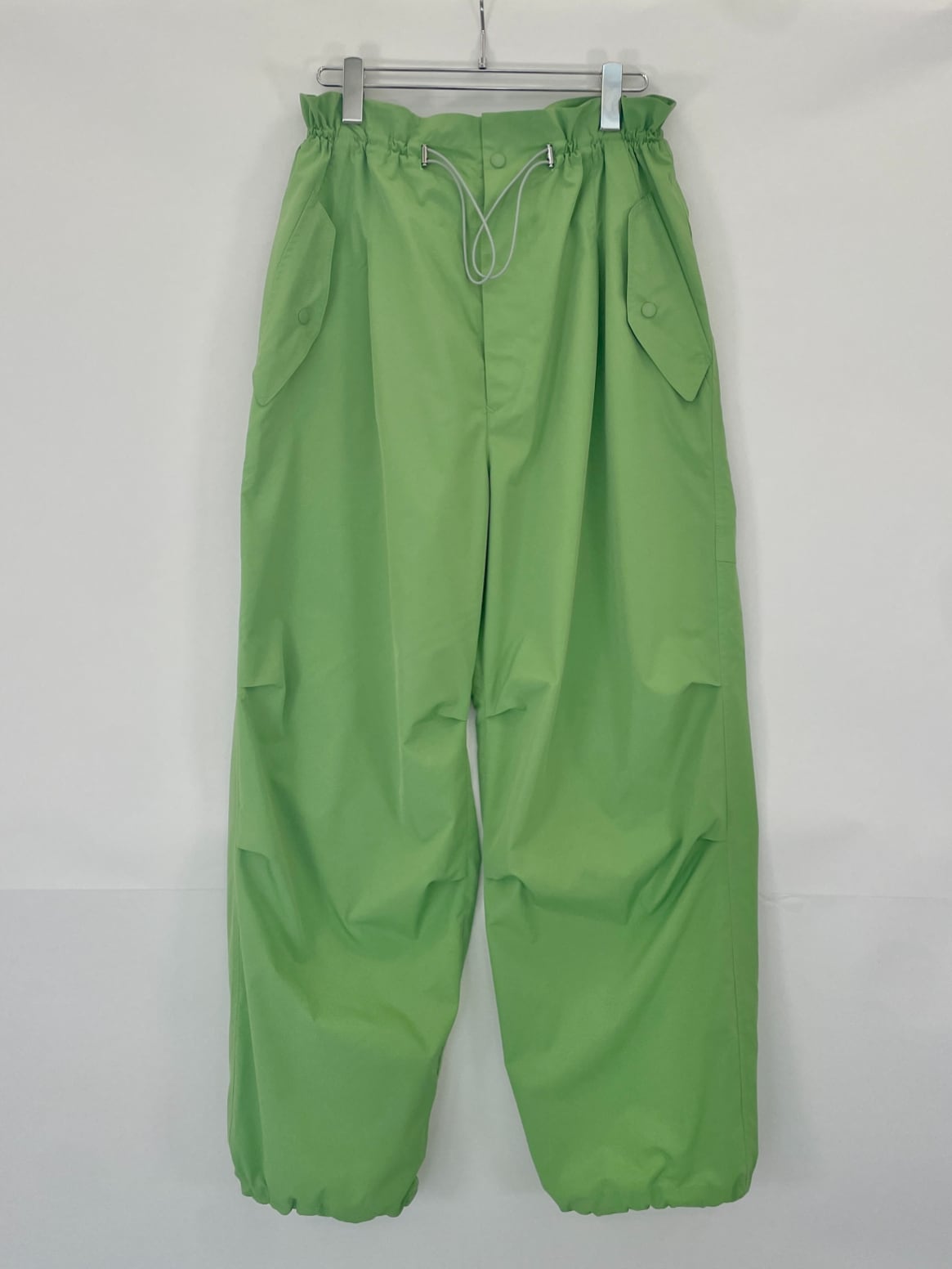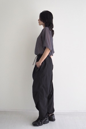 フラップ付きのポケットが程よくワークなアクセントを加えつつ、ウエストと裾にはドローコードを配し、シルエットやフィット感を⾃在に調整できます。